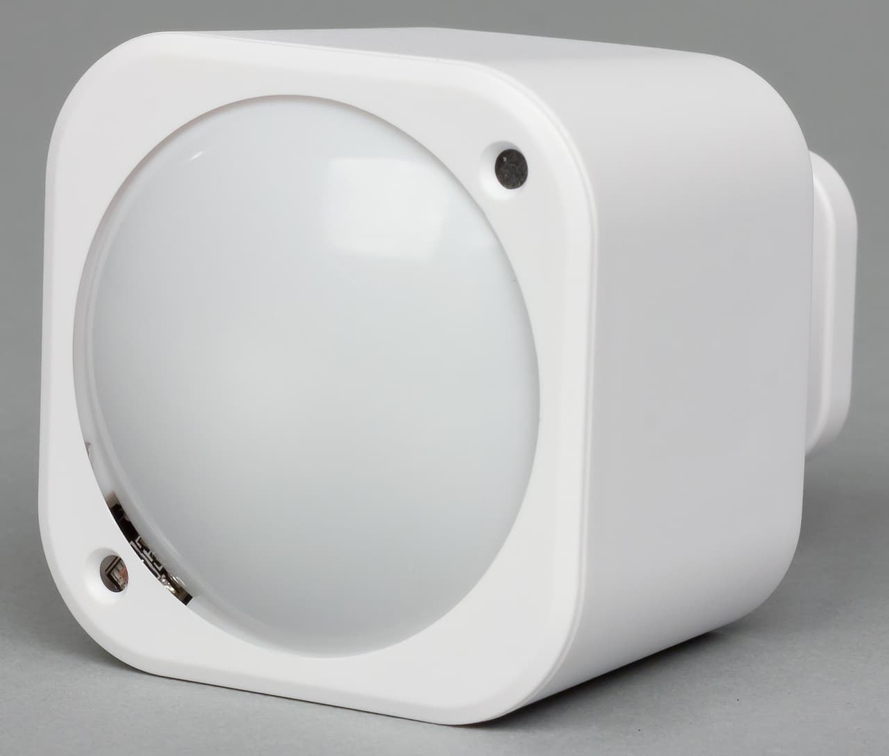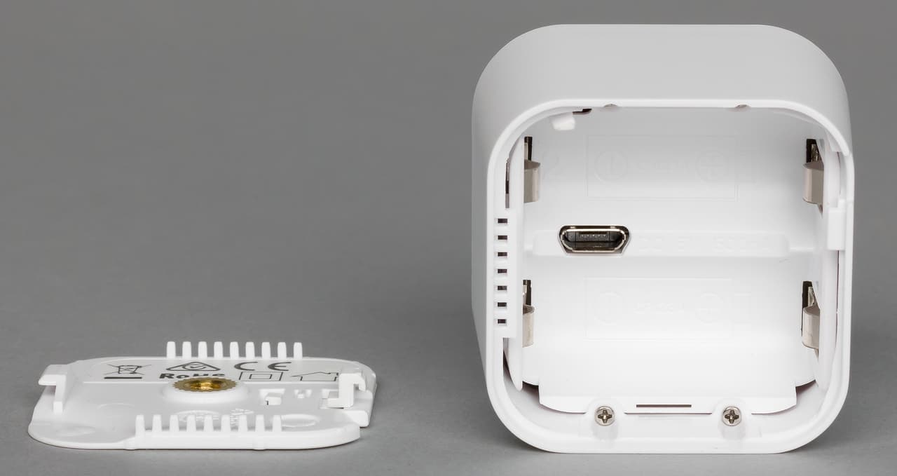Корпус датчика изготовлен из белого матового пластика. Габаритные размеры составляют примерно 46×46×40 мм. На передней стороне корпуса находится линза сенсора движения. По диагональным углам от нее — многоцветный индикаторный светодиод и датчик освещенности/UV. Задняя крышка съемная. За ней находится отсек для батарей и порт Micro-USB. В ее центре мы видим резьбовое крепление для шарнира. Один из углов используется как кнопка для включения датчика в сеть Z-Wave, исключения из нее и операции «разбудить». Обратим внимание, что явных отверстий для сенсоров температуры и влажности на корпусе нет, так что возможно оценка этих характеристик помещения будет происходить с некоторой задержкой. Весит устройство всего ничего — 35 г без элементов питания, 50 г с одной батареей и 65 г с парой батарей.