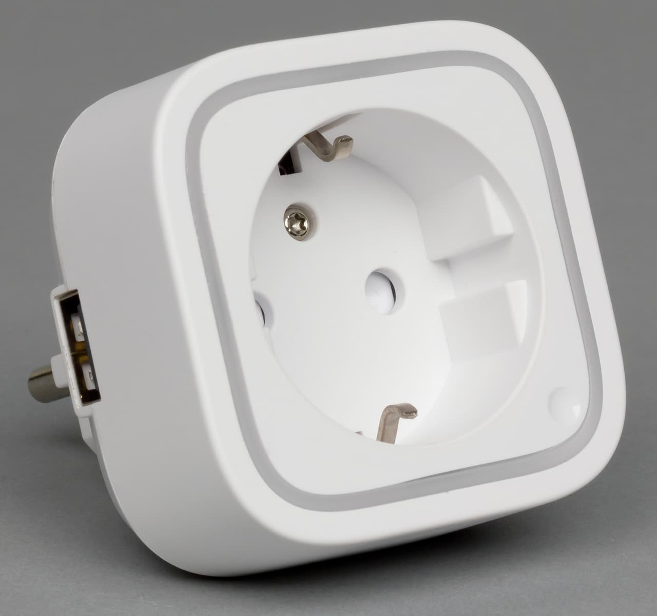 Корпус розетки изготовлен из белого матового пластика. Вилка и розетка имеют европейский «утопленный» формат с заземлением. Габаритные размеры внешней части составляют 60×60×35 мм. Так что устройство не будет блокировать соседние розетки при установке в стандартные настенные блоки. А вот в «пилотах» все будет сложнее. Несколько странно, что выход USB установлен на боковой стороне устройства, если отверстия розетки расположены по горизонтали. Более логичным и удобным вариантом была бы установка сверху (снизу). Отметим, что напряжение на этот порт подается всегда независимо от состояния основной розетки. Управлять им, к сожалению, нельзя. Нагрузочная способность заявлена как 1 А, в реальности некоторые мобильные устройства могут заряжаться и на 1,6 А.