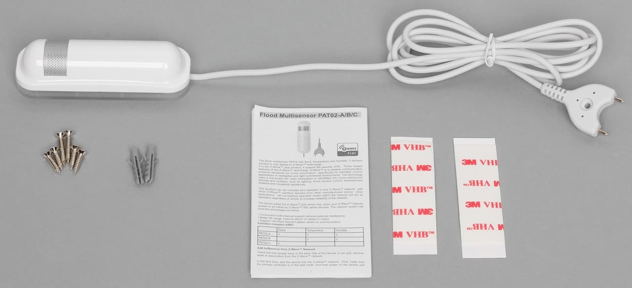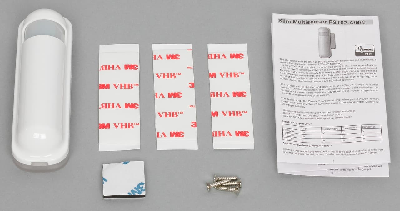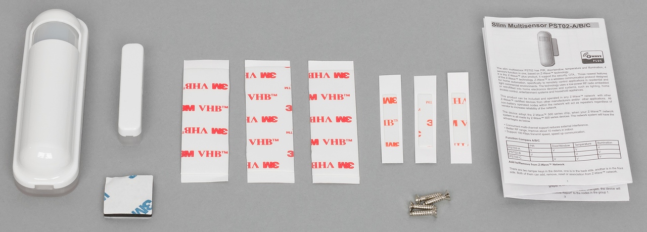 Отметим, что здесь артикул немного больше — перед последней буквой, обозначающий набор сенсоров, присутствует также цифра 5, что означает использование российской частоты Z-Wave. В других регионах применяются отличные от этой цифры. В комплект поставки входят сам датчик, батарея, инструкция, необходимые варианты креплений (шурупы, полоски двухстороннего скотча 3M), для датчика на дверь/окно — ответная часть с магнитом.