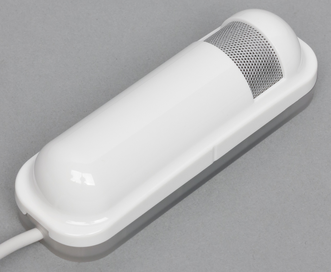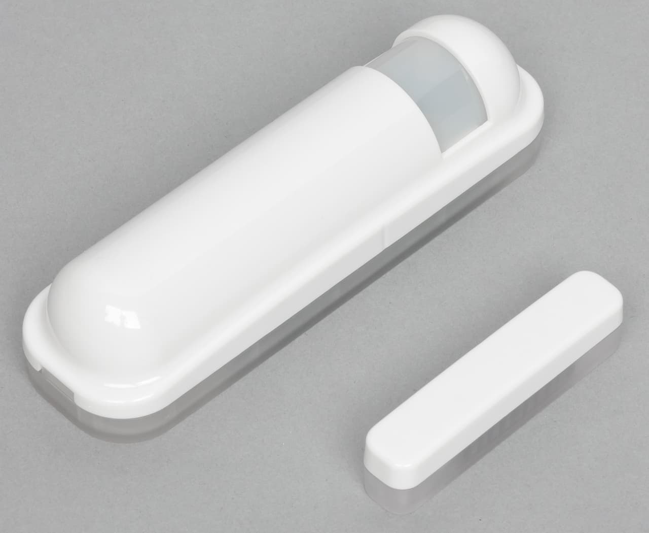 Основной блок представляет собой равнобедренный прямоугольный треугольник с катетами около 72 мм и толщиной 9 мм. Корпус изготовлен из белого матового пластика. Производитель отдельно отмечает, что датчик можно покрасить в цвет двери для менее заметного размещения.
