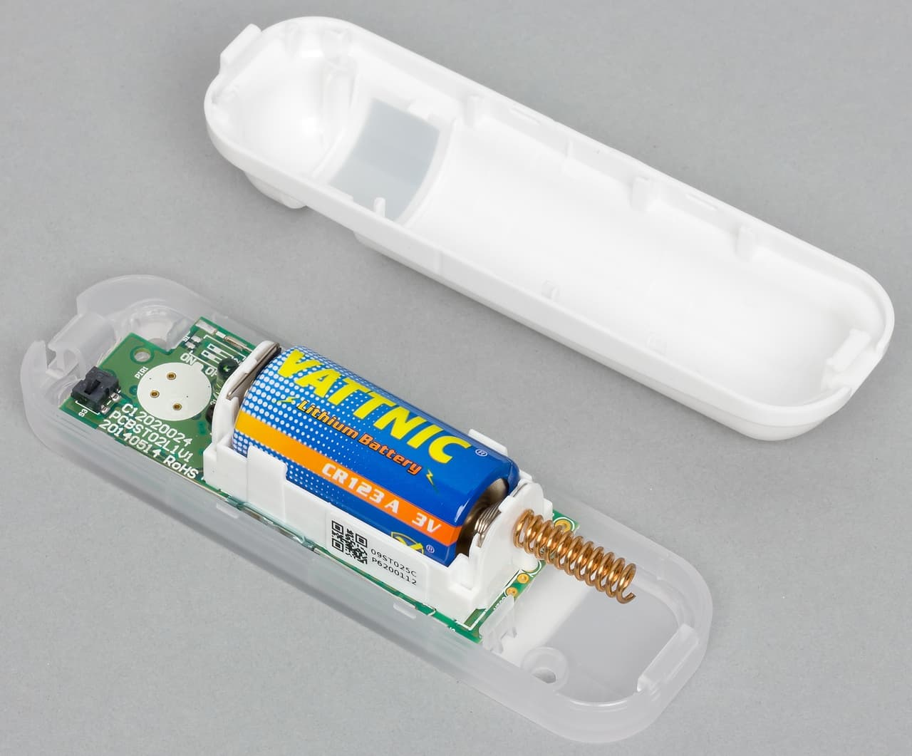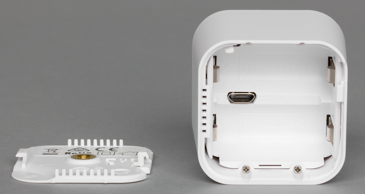 Компания предусмотрела два варианта питания устройства, так что вы сможете выбрать подходящий под ваши требования. Первый — два элемента формата CR123A, достаточно часто используемых в этом типе оборудования. Прогнозируемое время работы на них — два года. Конечно, реализовано информирование контроллера о состоянии батарей. Заметим, что датчик будет работать и от одной батареи, но менять ее нужно будет чаще. Срок службы зависит от многих факторов и настроек датчика, но в целом цифра вполне реальная.