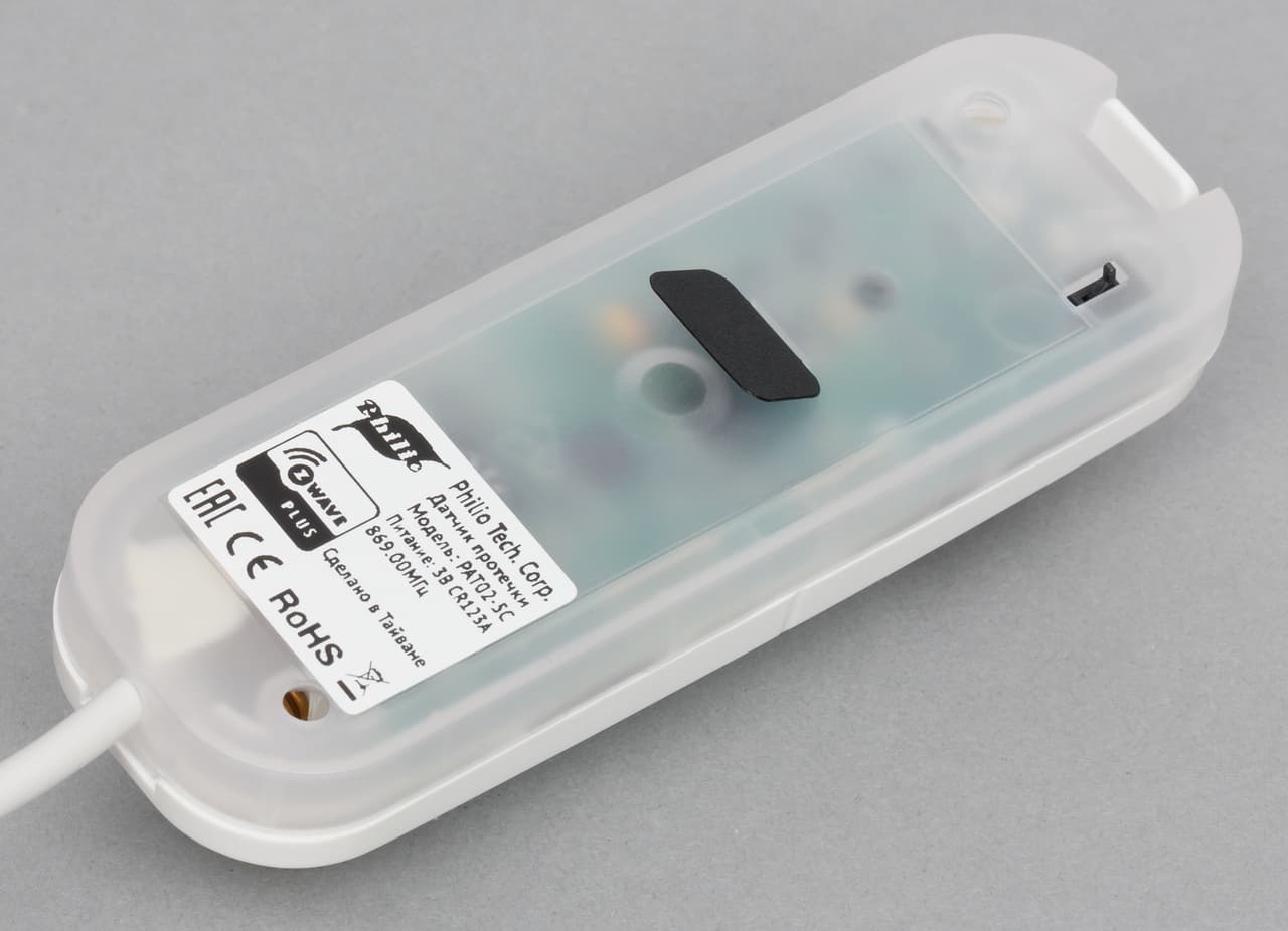 Сенсор протечки представляет собой проводной блок с парой металлических контактов, которые необходимо разместить в непосредственной близости к полу.
