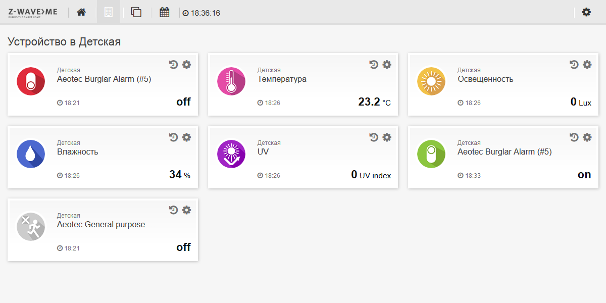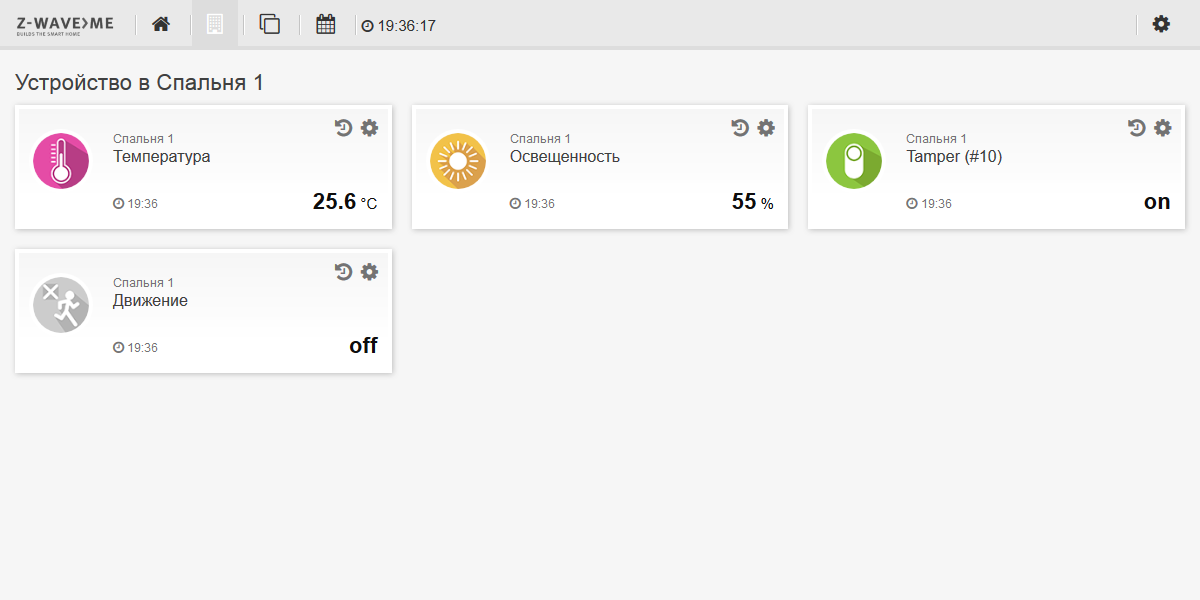 На контроллере модель отображается в виде трех устройств. Их интерпретация будет зависеть от программного обеспечения. Как и описанной выше модели мультисенсора, в данном устройстве реализован контроль качества сети Z-Wave c использованием встроенного многоцветного светодиода. В документации можно найти описание параметров датчика, среди которых есть настройка отправляемых при срабатывании команд, порог контроля уровня и частота проверки заряда батареи. Сложностей с интеграцией в Z-Way мы не встретили. Сенсор можно использовать для охраны, контроля климата и других сценариев.