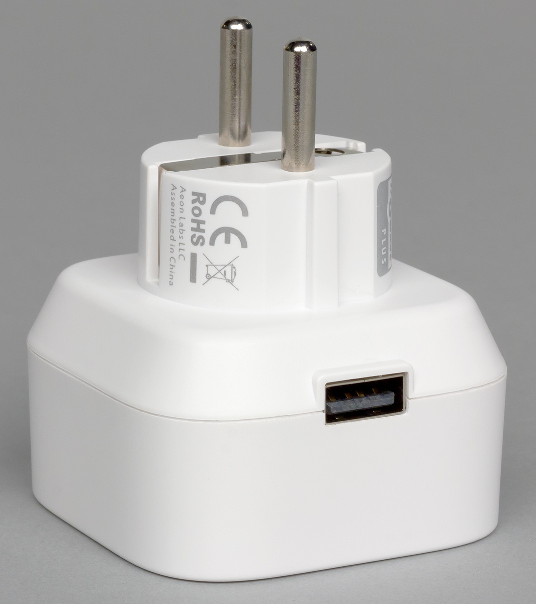 Третий продукт шестой серии Aeotec в этой публикации — управляемая розетка со встроенным измерителем потребляемой нагрузкой мощности и портом USB для зарядки мобильных устройств. Решение выполнено в знакомом «проходном» варианте и не требует от пользователя никаких электрических работ при установке.