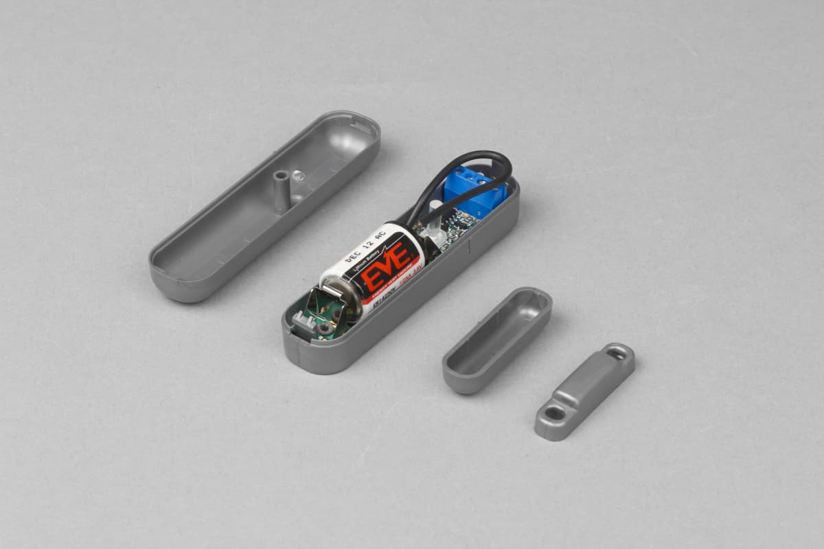 Он состоит из двух частей — собственно блока детектора со встроенным герконом и магнитом, устанавливаемым на створку. Размер основного блока — 75×17×19 мм, магнита — 35×11×8 мм. Корпуса устройств выполнены из пластика. Исполнение данной модели позволяет использовать ее только внутри помещения. Есть возможность выбора цвета корпуса из нескольких вариантов. В комплекте идет инструкция на английском языке (по информации от поставщика, ожидается появления и русской документации для всех продуктов), винты с дюбелями и двухсторонние клейкие полоски для крепления (использовать можно любой из двух вариантов).