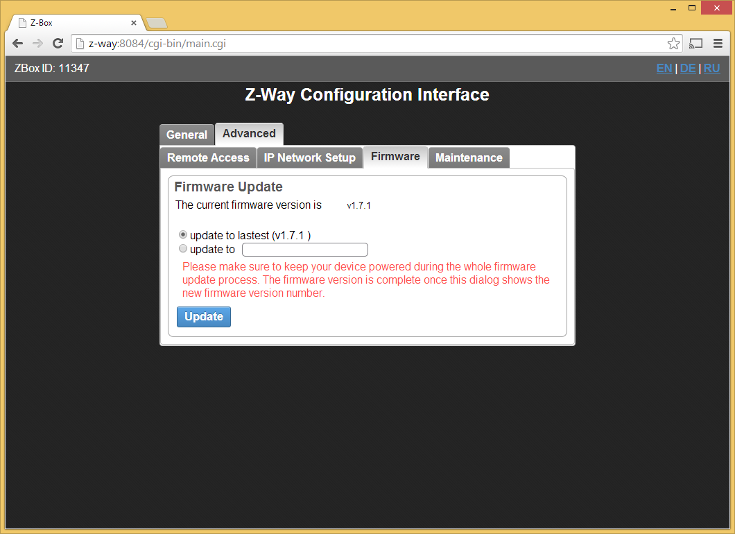 В базовой поставке присутствует отдельный интерфейс для некоторых системных операций. В частности он позволяет изменить IP-адрес устройства, обновить прошивку (в тестировании использовалась 1.7.1), перезагрузить устройство, настроить защищенный паролем удаленный доступ через портал find.z-wave.me.