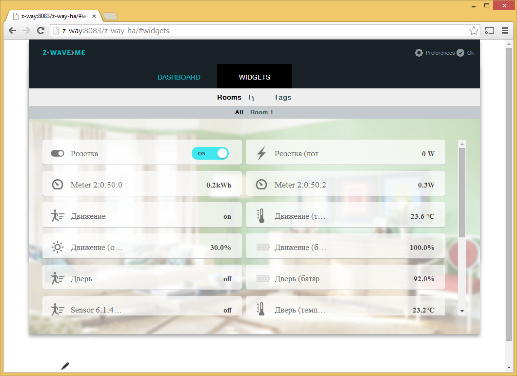 На втором находятся все запрограммированные в системе модули. В случае, если их очень много, потребуется вертикальная прокрутка, а быстро найти нужный виджет помогут фильтры по комнате, типу или тегам. Отметим, что виджеты могут как представлять аппаратные устройства, так и быть виртуальными (программными). Более подробно о втором варианте мы расскажем далее. При этом одному устройству может соответствовать несколько блоков, как, например, уровень заряда батареи у автономных датчиков. В верхней строке присутствует индикатор системных событий, а также кнопка «Preferences» для доступа к настройкам системы.