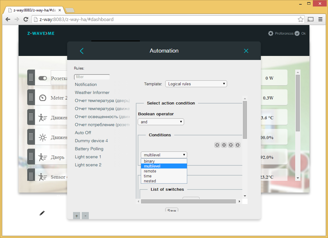 - Logical rules — создание алгоритмов работы системы, в правилах наступления события участвуют в частности бинарные и мультиуровневые датчики, а также время (только время суток, без дня недели), допускается использование логических операторов и вложенных условий, при выполнении условия происходит управление выключателями, диммерами и активация сцен;