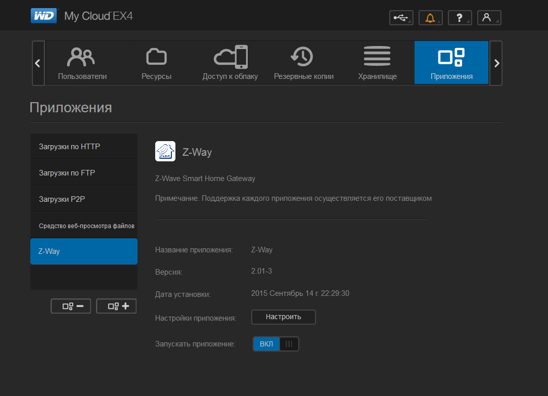 Для нашей цели важно, что пользователь может устанавливать на устройство дополнительные приложения из официального каталога, готовых файлов пакетов и даже через консоль. Отметим, что требуемый программный модуль работает и на других моделях сетевых накопителей серии My Cloud. В данном тестировании использовалась версия Z-Way 2.01-3.