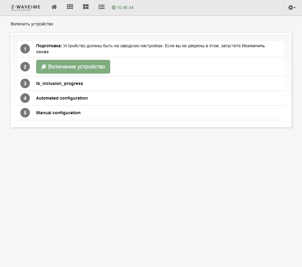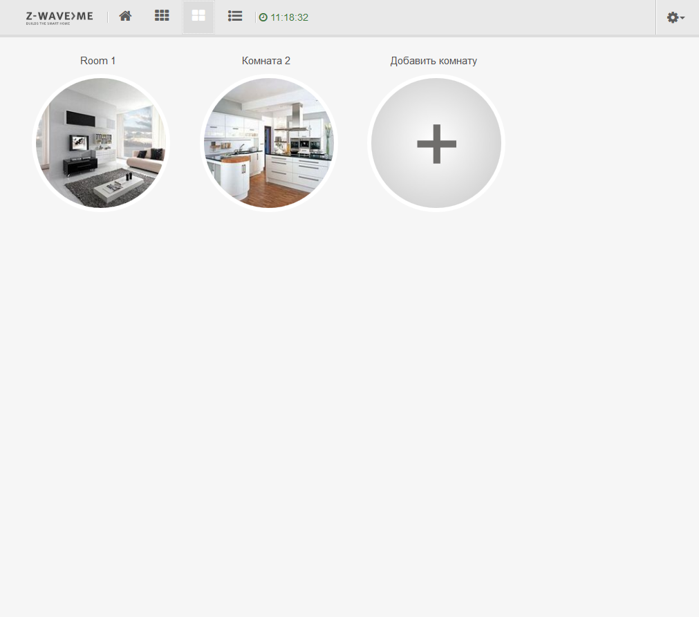 Для подключения нового устройства нужно зайти в системное меню, доступное по шестеренке в правом верхнем углу экрана, и выбрать в нем пункт «Устройства». Данная реализация поддерживает работу только с Z-Wave, так что далее выбираем эту кнопку и включаем на контроллере режим поиска новых устройств, который сопровождается миганием синего светодиода в адаптере.
