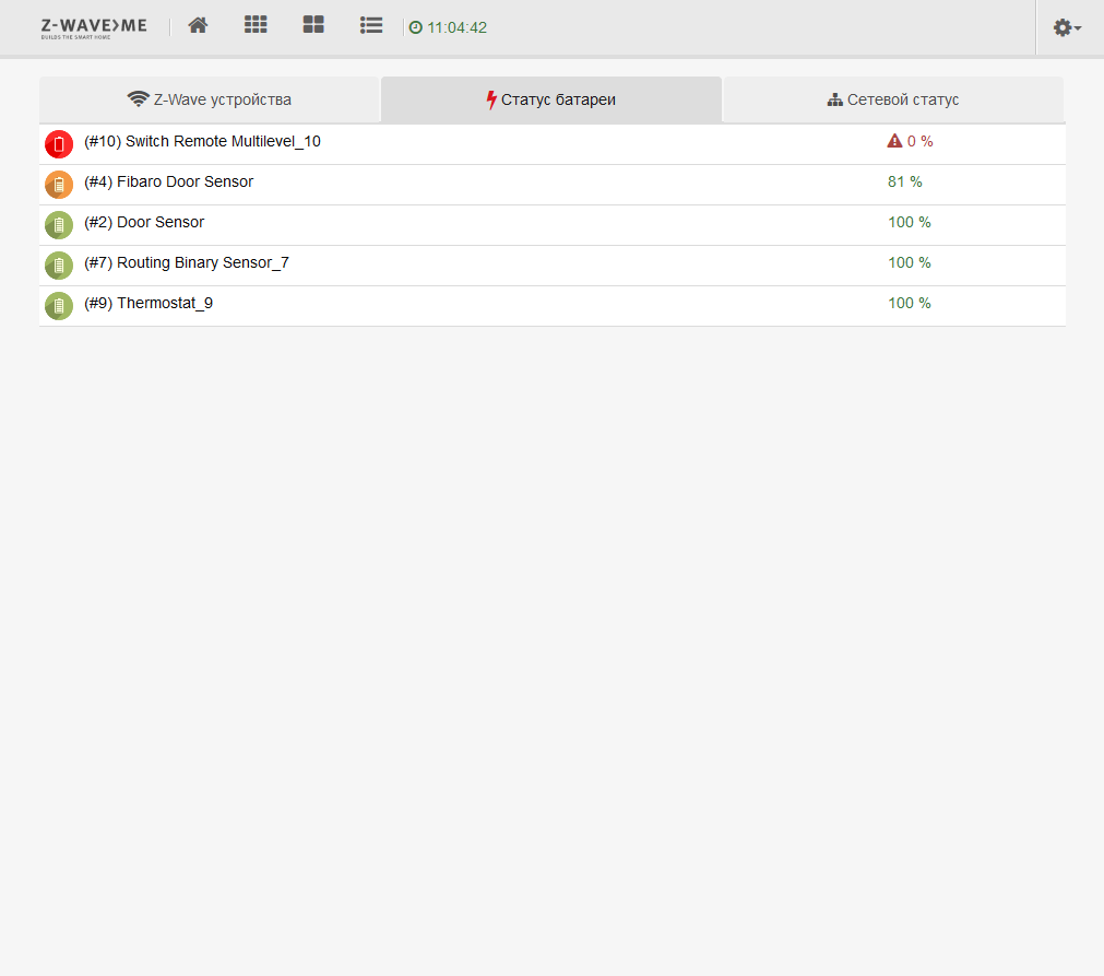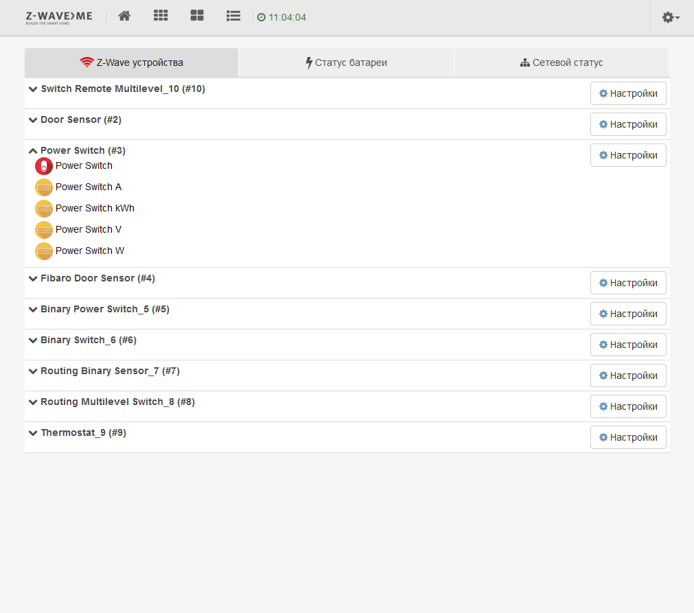 Раздел «Z-Wave сеть» позволяет удобно оценить текущее состояние сети и устройств. На первой вкладке мы видим их полный список, в том числе и все их компоненты.