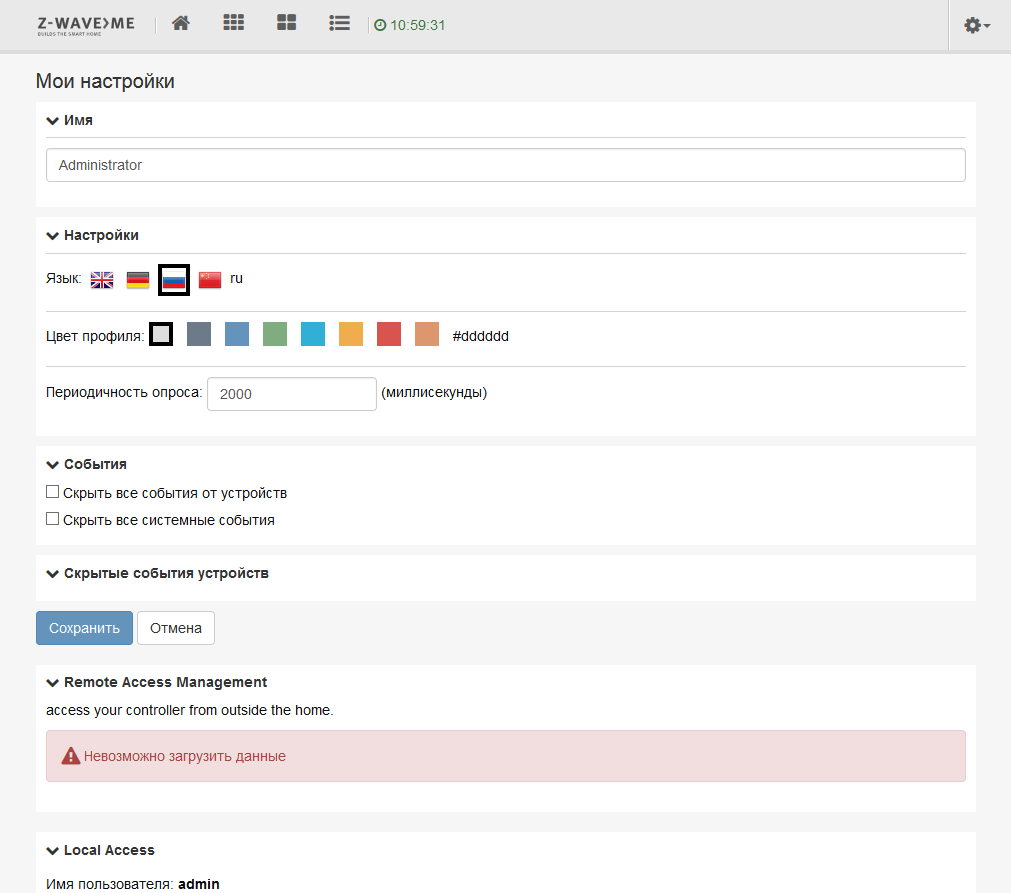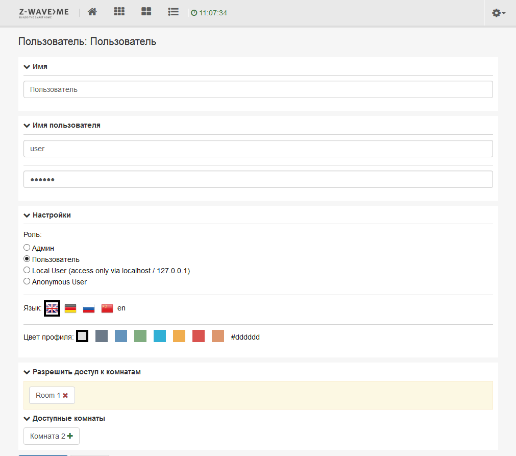 Основной пользовательский интерфейс системы автоматизации доступен по ссылке http://wdmycloudex4:8083/smarthome, где имя хоста определяется настройками сетевого накопителя. Использование собственного номера порта исключает конфликты с другими модулями и системными сервисами. Предусмотрено использование русского языка (а также английского, немецкого и китайского), но в некоторых местах все-таки встречается английский. Заметим, что доступ к системе закрыт паролем, который стоит изменить при первой возможности.