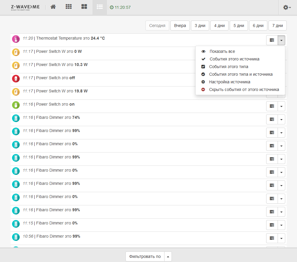 Последняя страница отображает список событий, обработанных сетью Z-Wave. В нем также есть опции по установке фильтра для более удобного поиска требуемой информации.