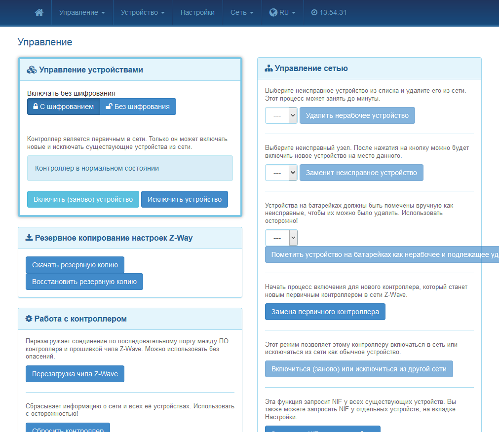 В определенных случаях будет полезен специальный экспертный интерфейс для точной настройки Z-Wave устройств, доступный по адресу http://wdmycloudex4:8083/expert. В нем представлена более детальная информация о работе сети, состоянии устройств, а также их настройки, включая возможность установки специальных параметров.