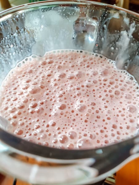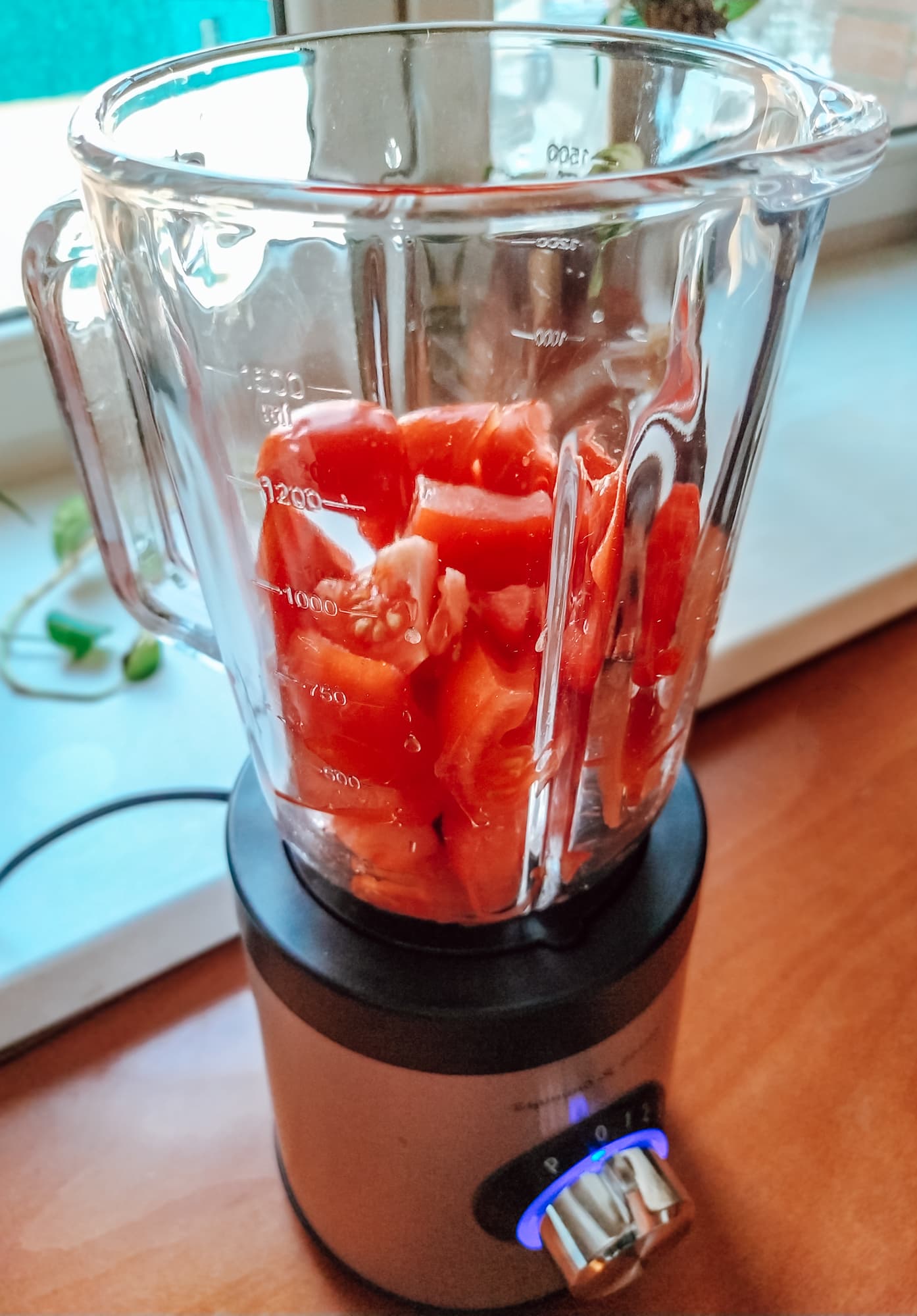 Уже через четыре секунды блендируемые на второй скорости томаты превратились в пюре. Мы подождали еще 8 секунд и выключили блендер. В чаше пузырилась розоватая масса.