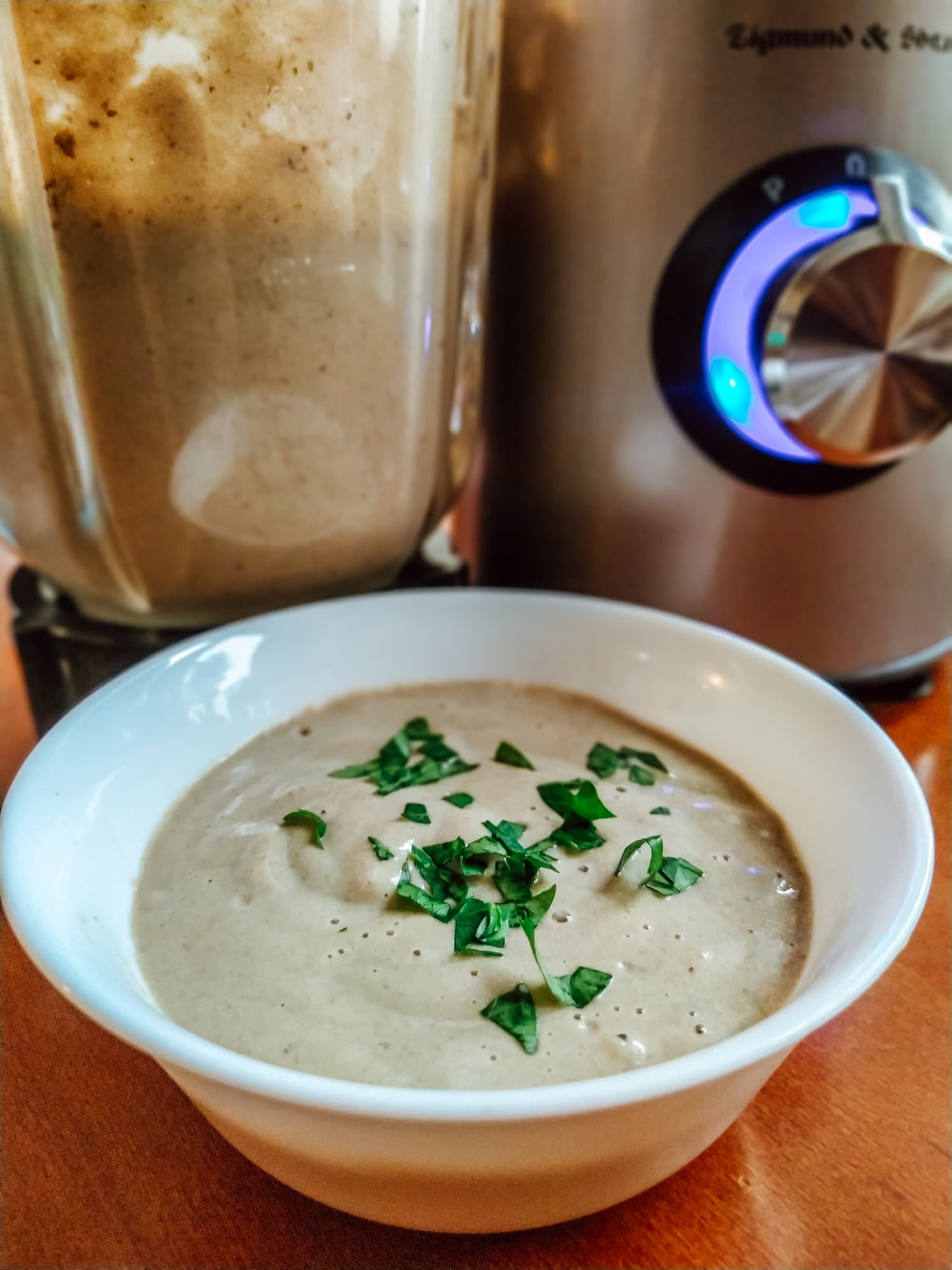 Дождавшись, когда продукты остынут до положенных 60 °C, картофель с отваром и грибы загрузили в блендер и включили его на второй скорости. Когда содержимое чаши превратилось в пюре, перешли на третью скорость. Через несколько секунд мотор забуксовал. Мы отключили прибор, залили в чашу подогретые сливки и, чуть подождав, продолжили измельчение. Весь процесс занял полторы минуты, суп получился идеально однородным, только на стенках чаши было немного заметных частичек шампиньонов. Все бы хорошо, но снова лабораторию наполнил противный запах паленого.
