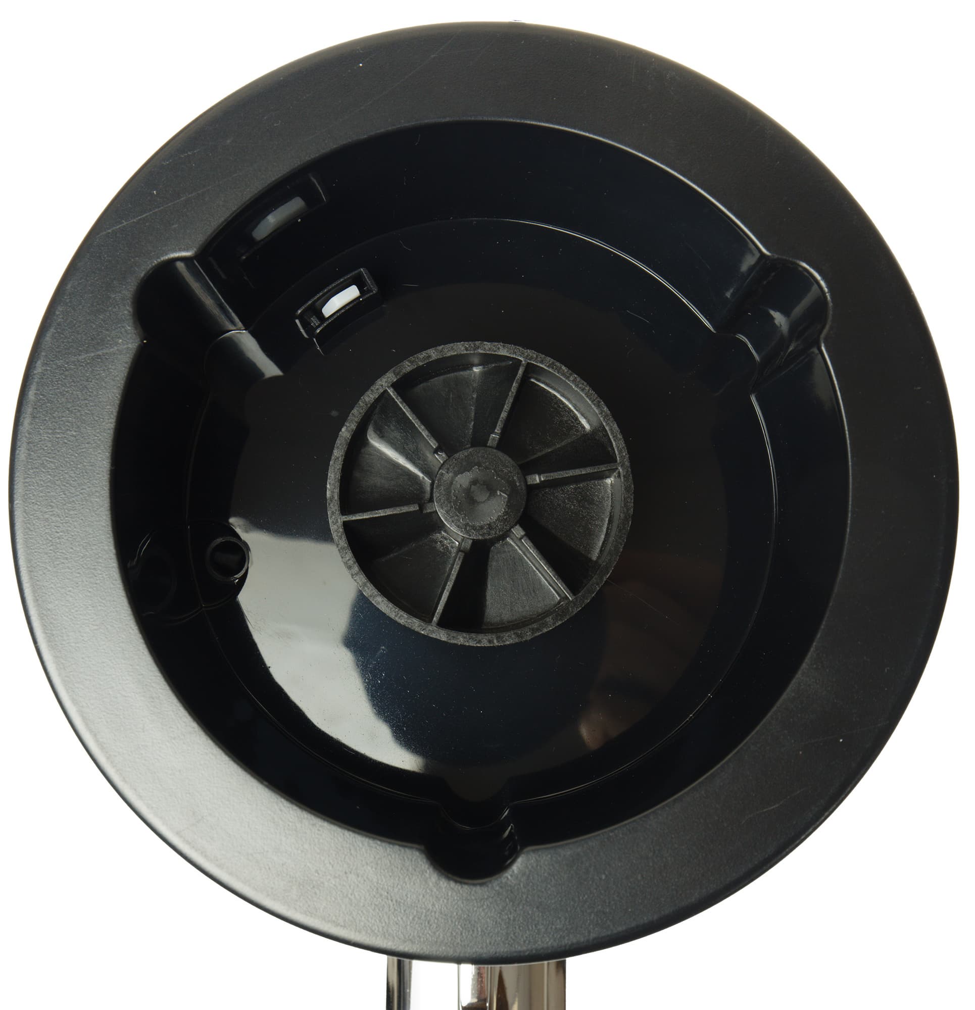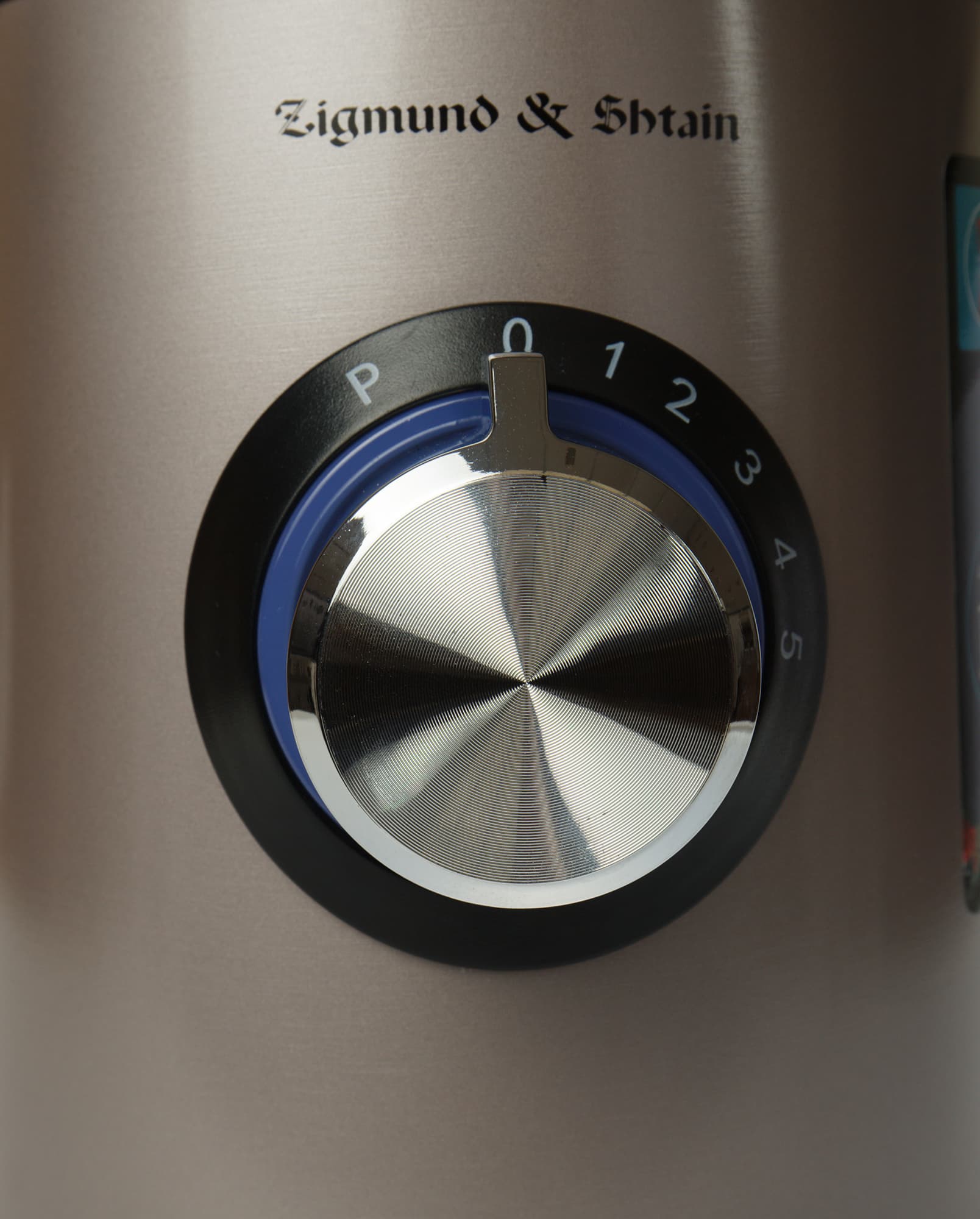 Моторный блок кажется цилиндрическим, но он слегка сужен к верху. На фронтальной стороне — поворотный переключатель, подсвечивающийся синим, когда прибор включен в розетку.