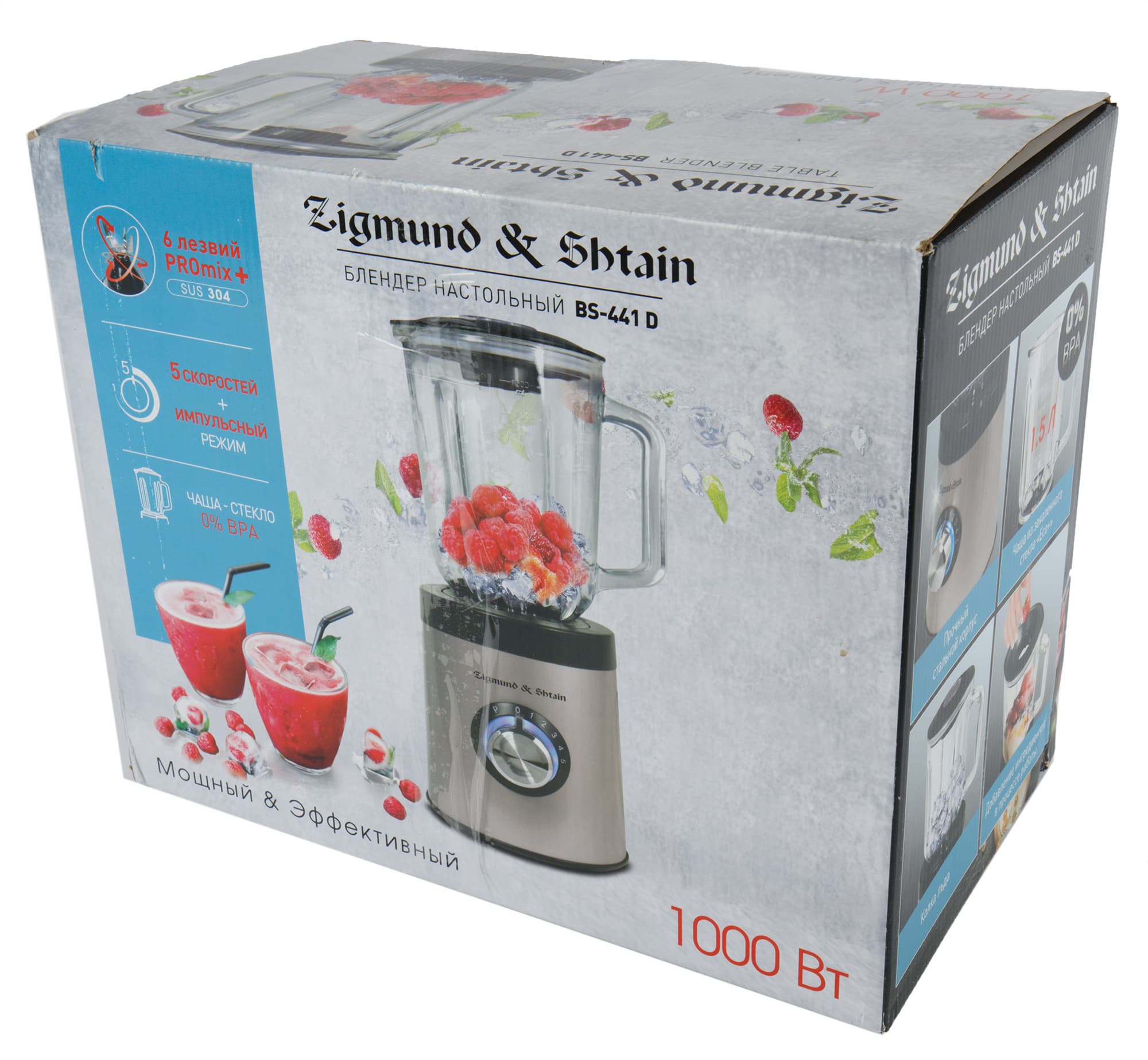 Zigmund & Shtain BS-441D поставляется в очень симпатичной, даже романтичной коробке: на сером фоне изображен блендер в окружении ягод клубники, листьев мяты и кусочков льда. Дополняет эту пастораль бирюзовая вставка, на которой перечислены достоинства прибора: 6 лезвий, 5 скоростей плюс импульсный режим, стеклянная чаша. На боковых гранях коробки можно ознакомиться с прочими техническими данными прибора.