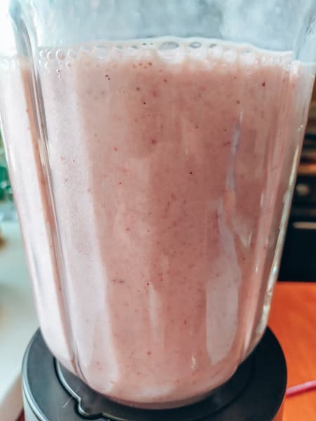Залили в чашу молоко и включили блендер на второй скорости. Всыпая кусочки банана через отверстие в крышке, постепенно увеличивали скорость и установили пятую, когда пришла очередь клубники. Через минуту перед нами был однородный воздушный коктейль.