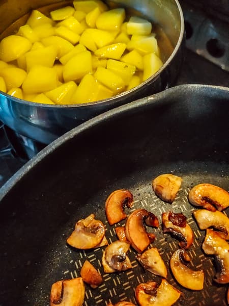 Для приготовления этого супа мы отварили небольшое количество картофеля и обжарили шляпки шампиньонов порциями, чтобы они не тушились, а именно поджаривались: только так раскроется вкус грибов.