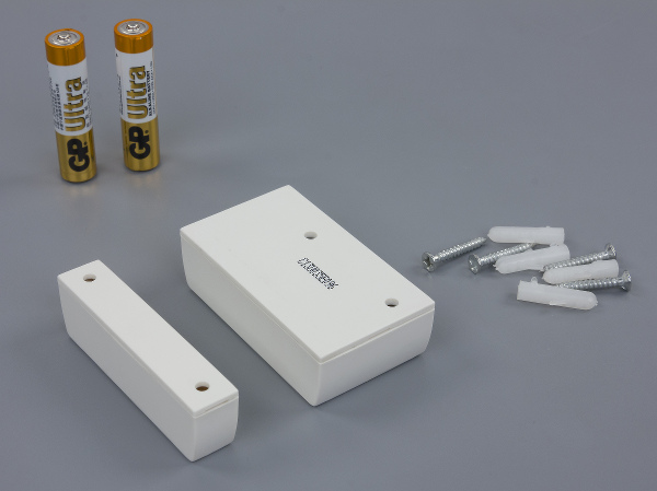 Рассматриваемая модель, как и другие аналогичные устройства, состоит из двух блоков — основного и дополнительного элемента со встроенным магнитом. Размеры их достаточно велики: 33×18×58 и 11×18×58 мм соответственно. Обусловлено это использованием двух батарей формата AAA для питания основного блока. Магнит можно было бы сделать и поменьше, но производитель предпочел вариант согласованных размеров блоков. Корпуса изготовлены из белого матового пластика. Крепление блоков осуществляется через пары отверстий шурупами. В некоторых ситуациях возможно удобнее будет использовать двухсторонние клейкие полоски.