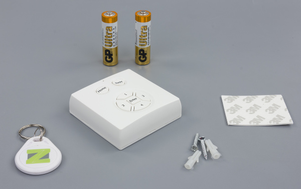 Для управления системой умного дома можно использовать приложения для ПК и мобильных устройств, но некоторые операции гораздо проще выполнять обычными кнопочными выключателями или панелями. В этот раз в составе системы мы использовали специальную панель контроля доступа. Это компактное устройство (размеры составляют 63×63×19 мм) имеет корпус из матового пластика белого цвета. На передней панели находятся: светодиодный индикатор, кнопки Home и Away, четыре цифровых кнопки и клавиша Enter. Кроме светодиода, есть звуковая индикация событий и состояния устройства. Внутри размещаются отсеки для двух батарей AA, датчик вскрытия, а также считыватель NFC-меток. В комплект поставки входит инструкция, винты и двухсторонняя клейкая лента для крепления, две батареи, одна NFC-метка. К большому сожалению, вынуждены отметить, что произвольные NFC-метки данная панель использовать не позволяет. В случае необходимости придется приобретать их у этого же производителя или искать совместимые модели определенного формата.