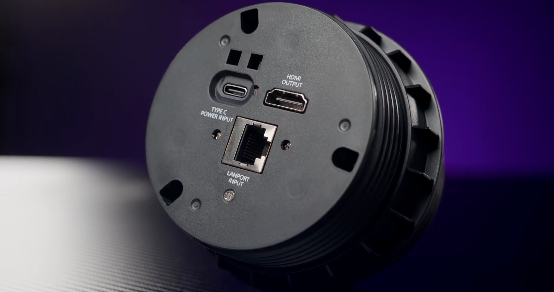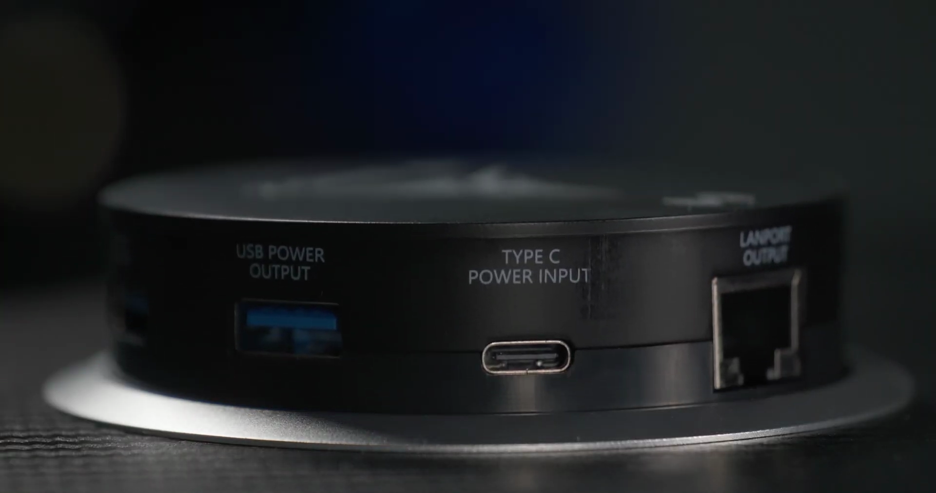 Углов у столешницы нет. Это и выглядит хорошо, и для здоровья полезно. Спереди, где стол обычно прислоняется к стене, есть вырез, который используется для прокладки проводов. А еще по бокам есть два отверстия, одно из них сейчас у меня занято пластиковым кабель-каналом, а во втором стоит хаб, которые плавно и эффектно выезжает. И в нем целая куча разъемов под множество задач: 3 HDMI-входа и выхода (два сверху и один снизу, три USB 3.0 Type-A сверху, два USB Type-C тоже сверху для зарядки и для передачи видеосигнала; один USB Type-C находится снизу, и он предназначен для питания самого хаба; сквозной RJ-45 для сетевого кабеля; а еще хаб выступает в роли беспроводной зарядки мощностью 15 Вт. Наконец, в нём есть разъем для карточек microSD. Досадно что при этом никаких проводов в комплекте нет. И даже провод для питания в коробку не положили.