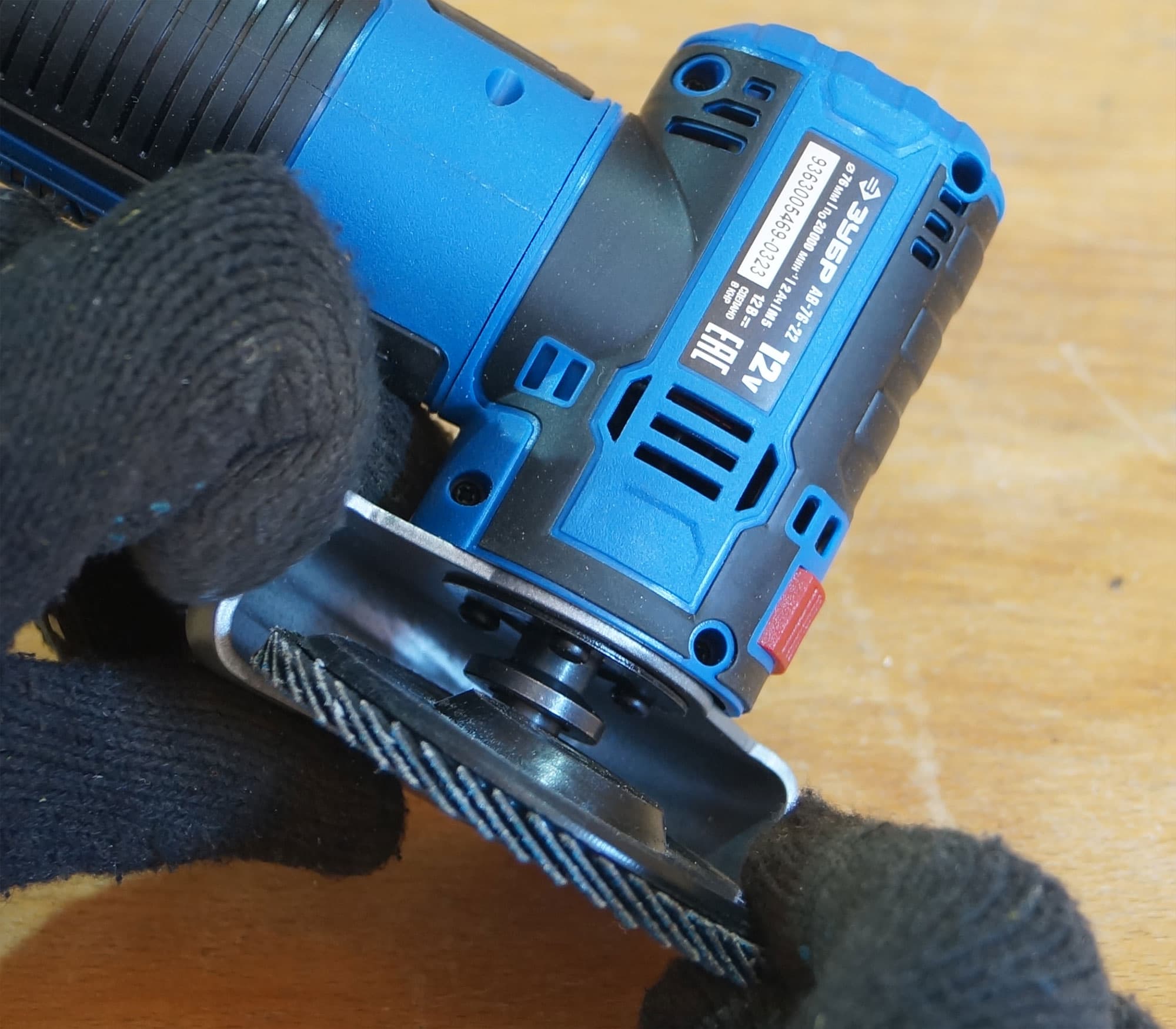 Правда, и этот небезопасный лайфхак не помог. По всей видимости, скорость вращения у рассматриваемой УШМ слишком велика для такого типа насадок. При включении болгарки с этой лепестковой насадкой возникает ненормальное биение. Сильнейшая вибрация активно передается руке, и все это сопровождается крайне неприятным, надрывно-тревожным звуком. Держать в руке работающую болгарку с такой насадкой просто опасно, и эксплуатировать инструмент с подобными расходниками, приводящими к сильной вибрации, строго воспрещается. К сожалению, данная лепестковая насадка, купленная за серьезные деньги в интернет-магазине (а в обычных магазинах о таких кругах даже не слыхали), не сопровождается никакой информацией — необходимые данные о максимальных оборотах и производителе начисто отсутствуют. Как ни жаль, но тестирование автономности этой профессиональной болгарки придется отменить. Так что смело возвращаем на место защитный кожух и забываем о существовании лепестковой насадки.