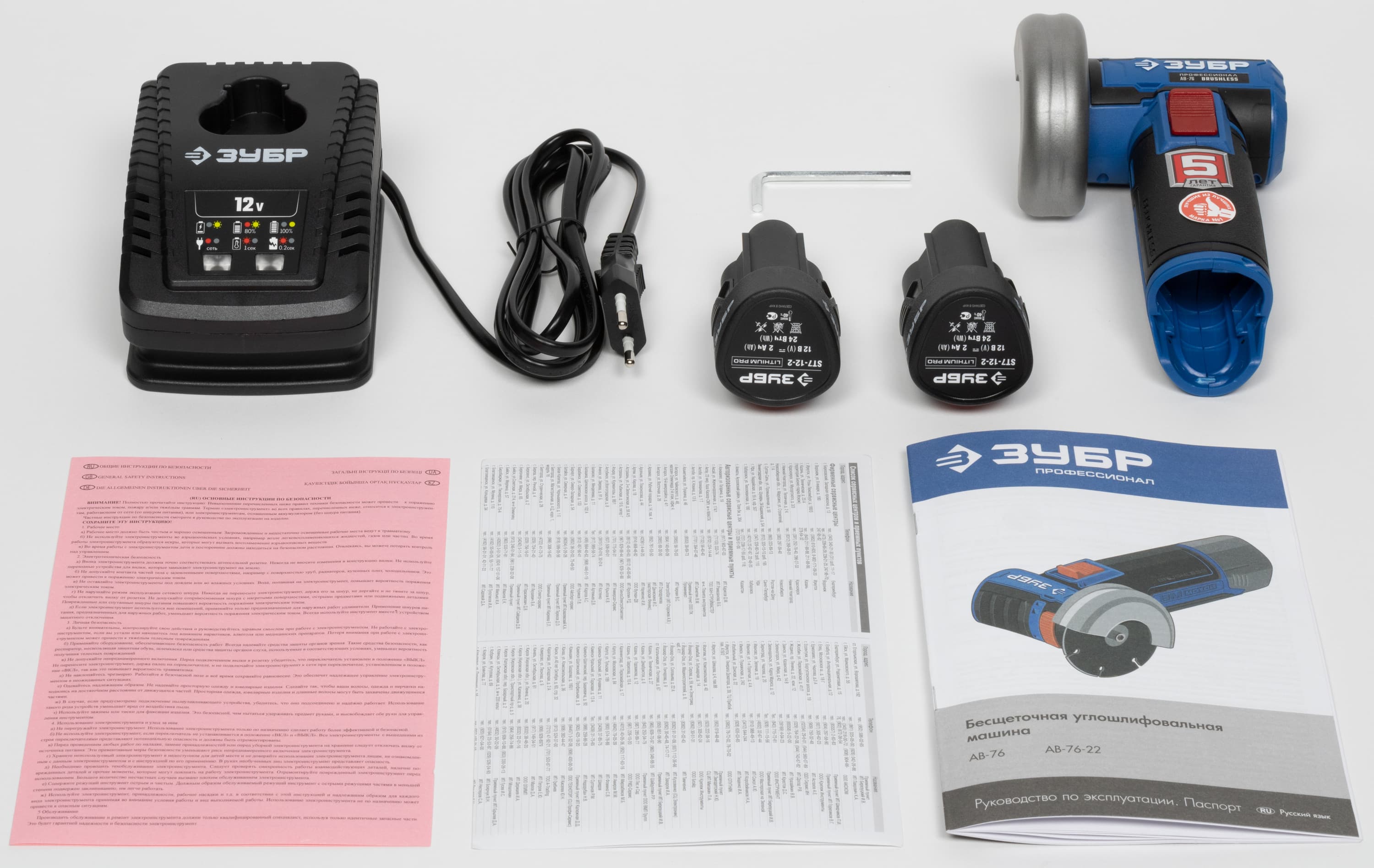 В комплекте с УШМ имеется установленный защитный кожух, ключ, два аккумулятора с зарядным устройством и печатная продукция. Жаль, что в комплекте нет никаких насадок.