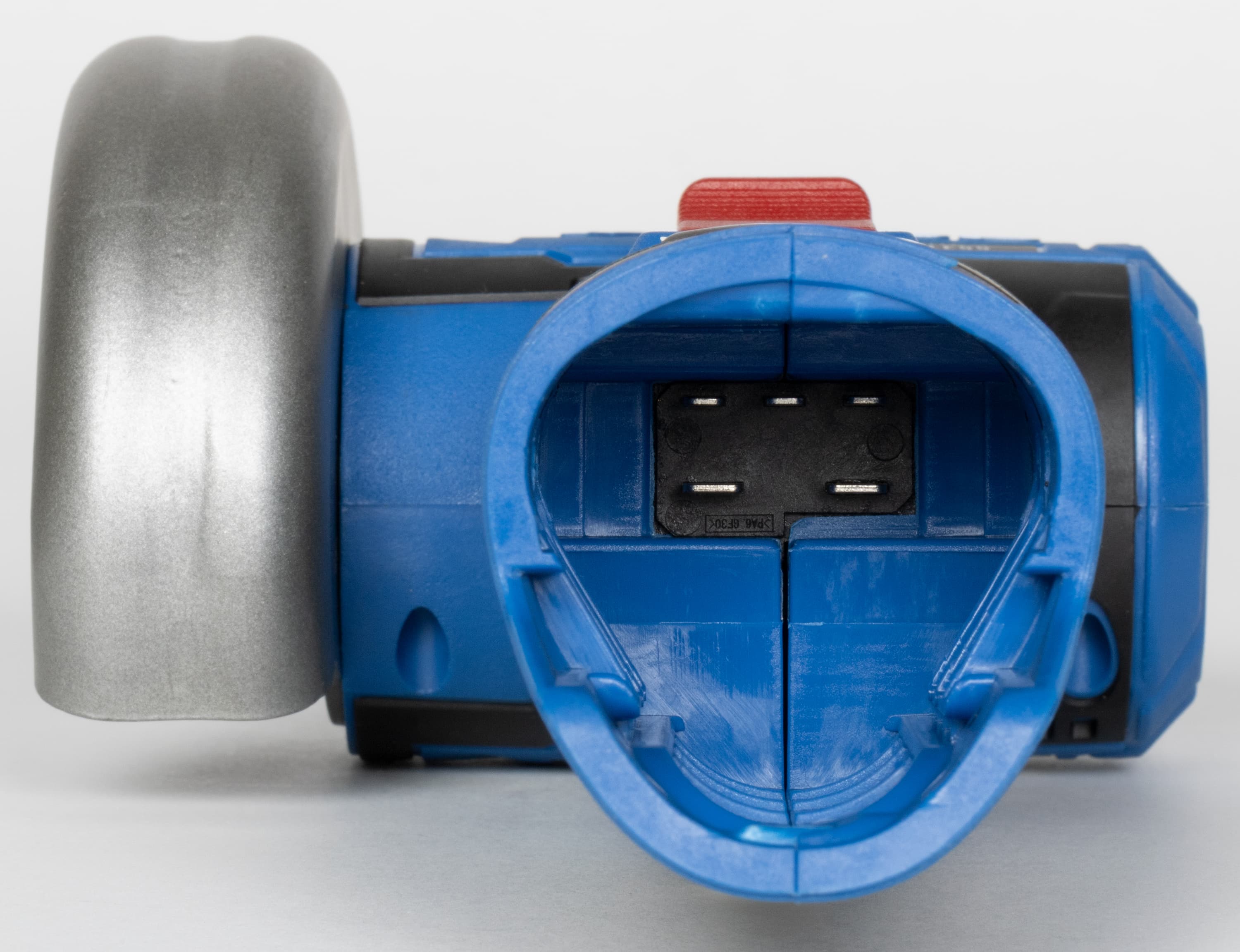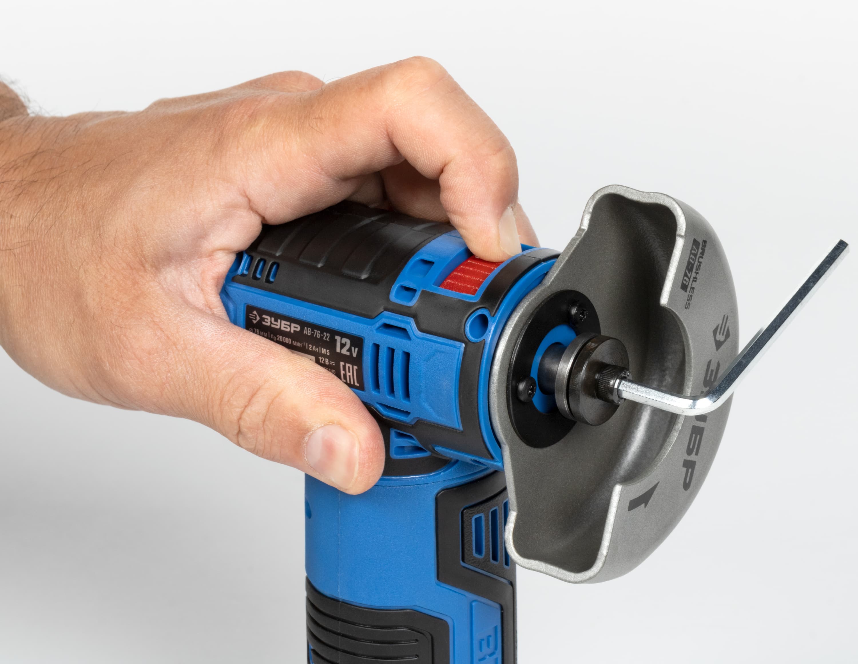 Обратите внимание на форму защитного кожуха: он прикрывает насадку не только сбоку, но и сверху. Есть подозрение, что из-за такой формы сюда поместится далеко не каждая насадка.