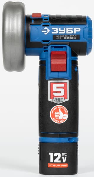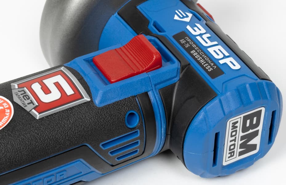 В рассматриваемой углошлифовальной машине работает бесщеточный двигатель. Управление производится обычным ползунковым переключателем с фиксатором. Переключатель находится на боку рукояти, под большим пальцем руки.