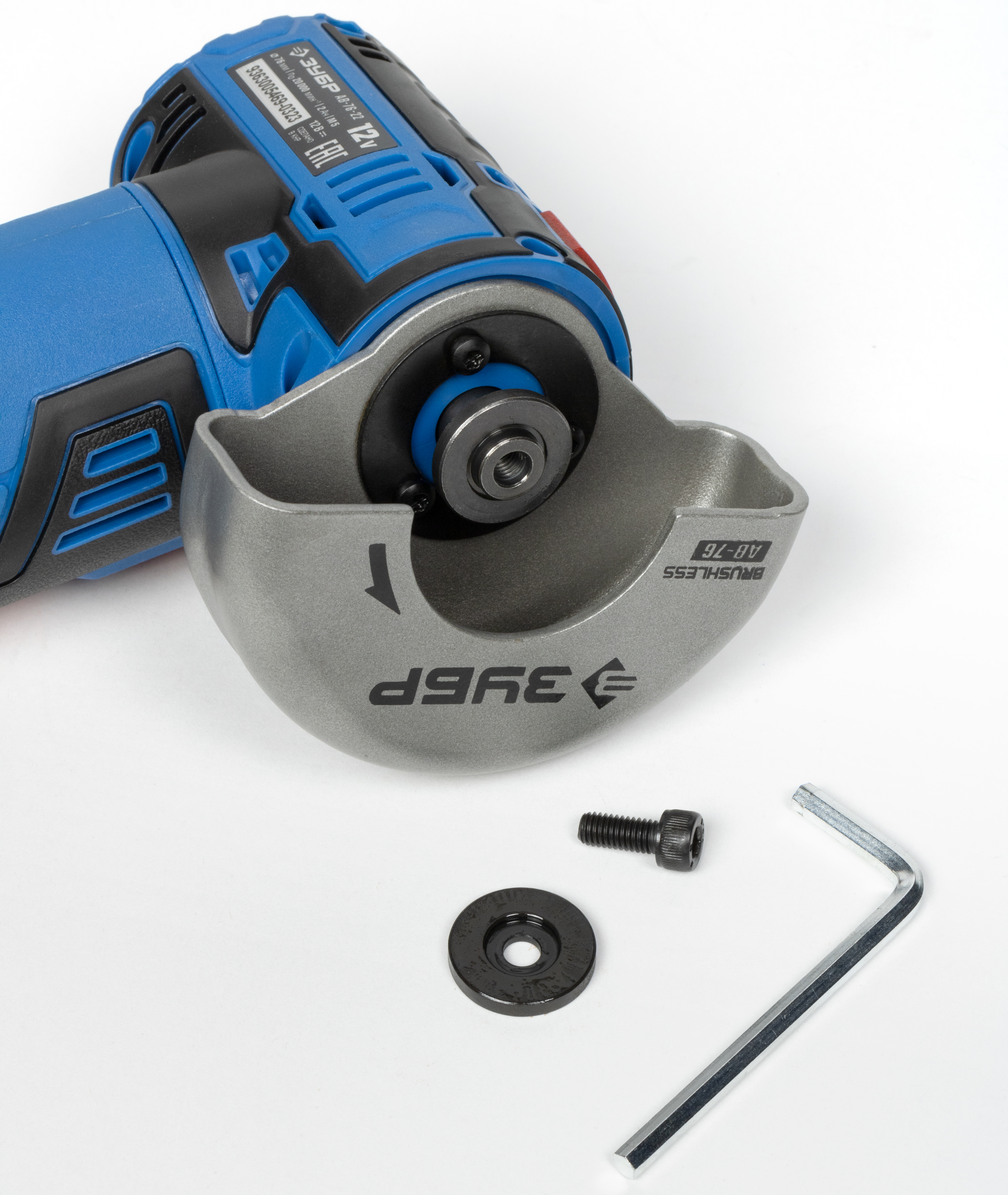 Защитный кожух закреплен на корпусе с помощью пластины, удерживаемой тремя болтами. Закреплен он не насовсем, пластина позволяет кожуху вращаться на 90°. Насадки крепятся шайбой, которая прижимается болтом с шестигранной головкой. Ключ этот легко потерять, как и шайбу с гайкой. Но другое решение здесь применить непросто, да и ни к чему.