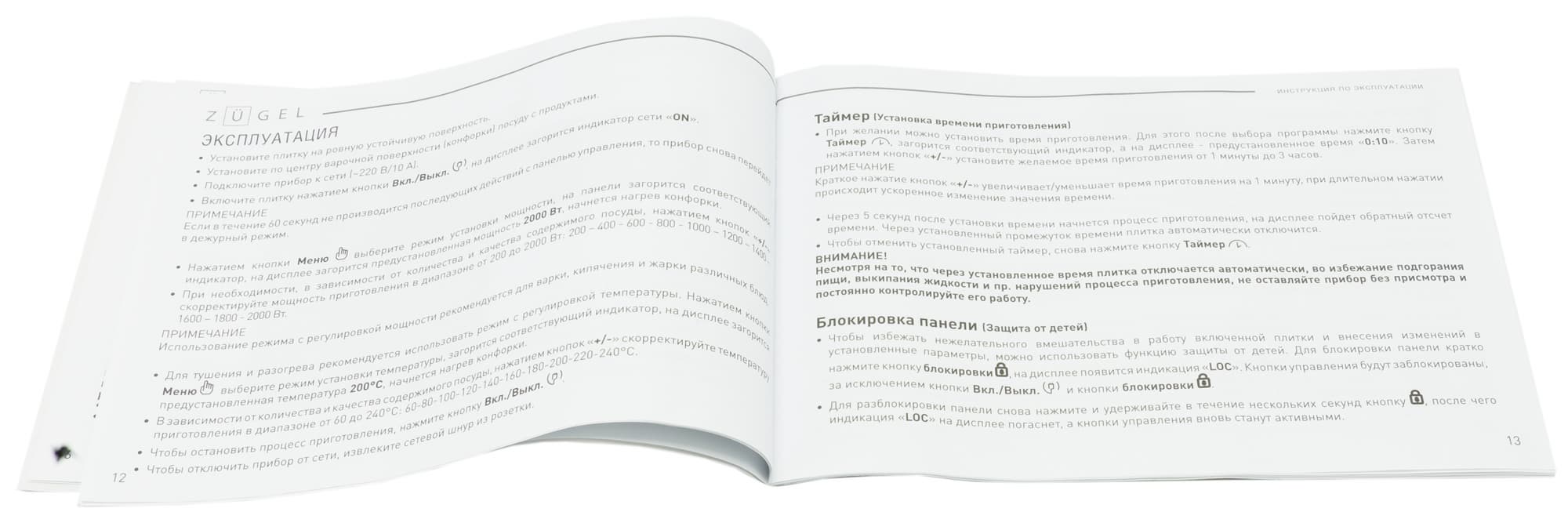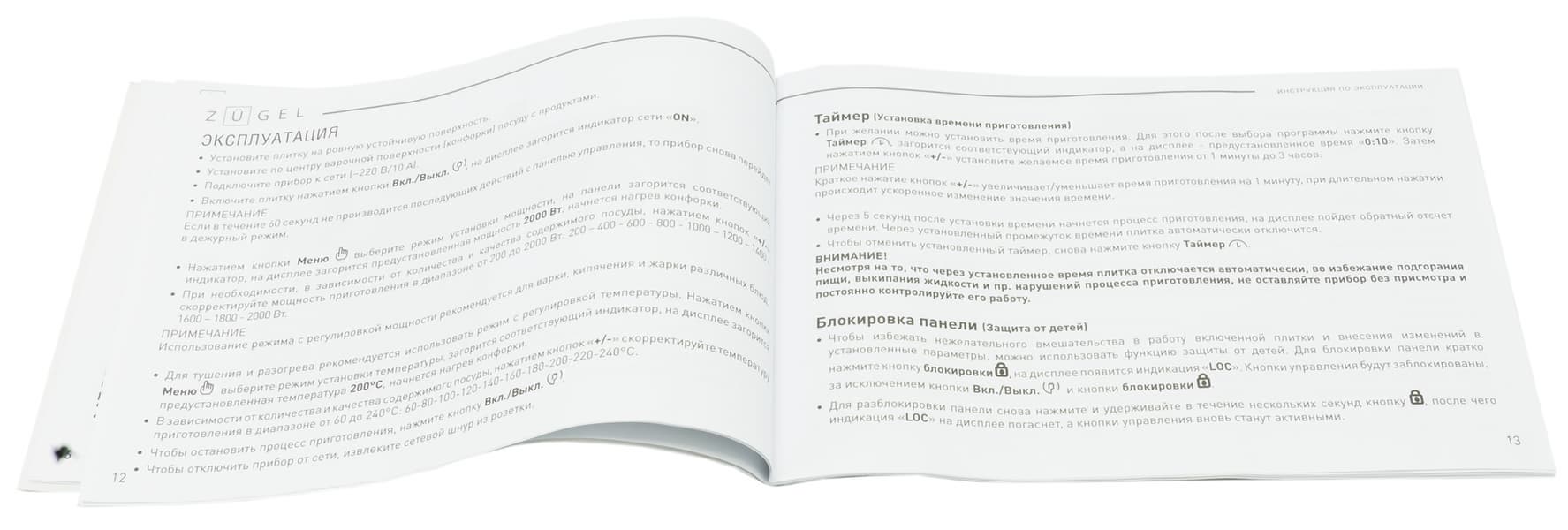 Руководство пользователя представляет собой 26-страничную брошюру формата А5, напечатанную на обычной бумаге. Содержание стандартно и включает в себя разделы, максимально охватывающие все аспекты взаимодействия с прибором: от мер предосторожности до утилизации. Также есть глава, посвященная выбору подходящей для индукционной плитки посуды.
