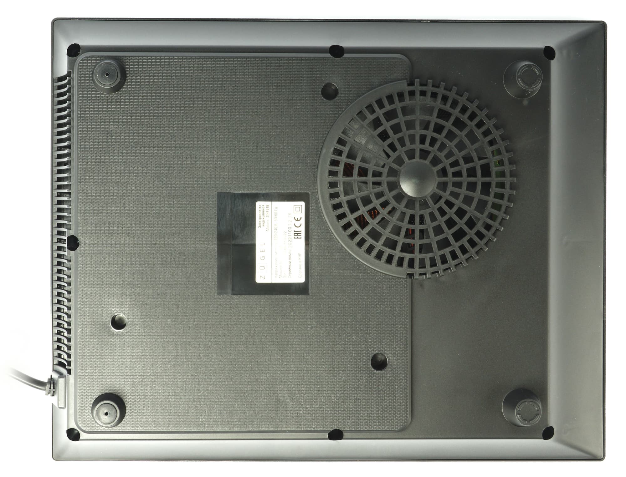 Внимательно рассмотрим элементы конструкции Zugel ZIHF61B со стороны дна. По центру увидим наклейку-шильдик с краткой технической информацией, вентиляционные решетки и четыре ножки, оснащенные прорезиненными накладками, противодействующими скольжению.