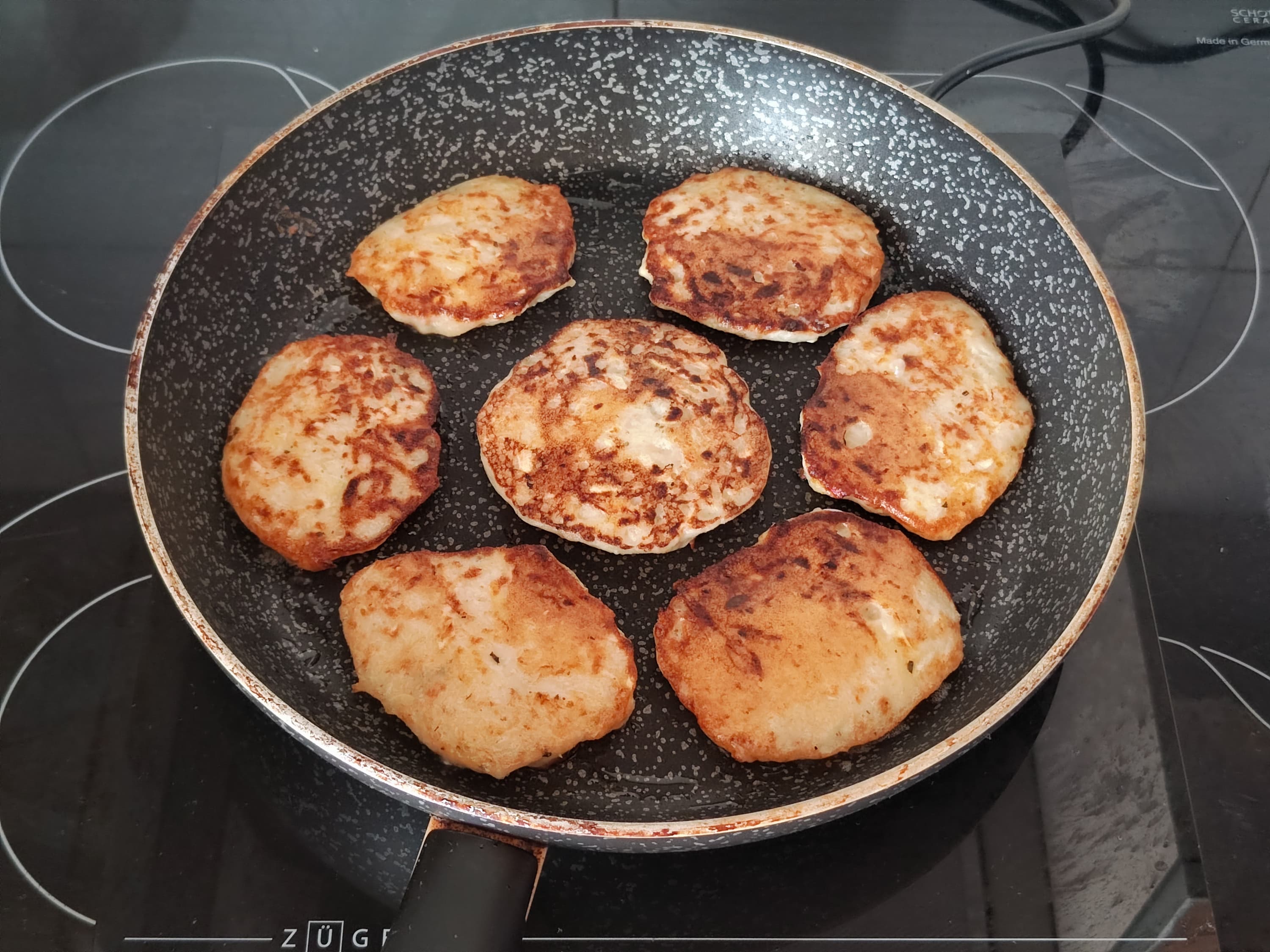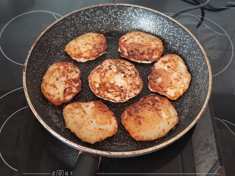 Начали обжаривать с 1200 Вт, но тогда оладьи оказывались поджаренными, но сыроватыми внутри. Снизили нагрев до 800 Вт — он оказался идеален для приготовления кабачково-картофельных оладий.