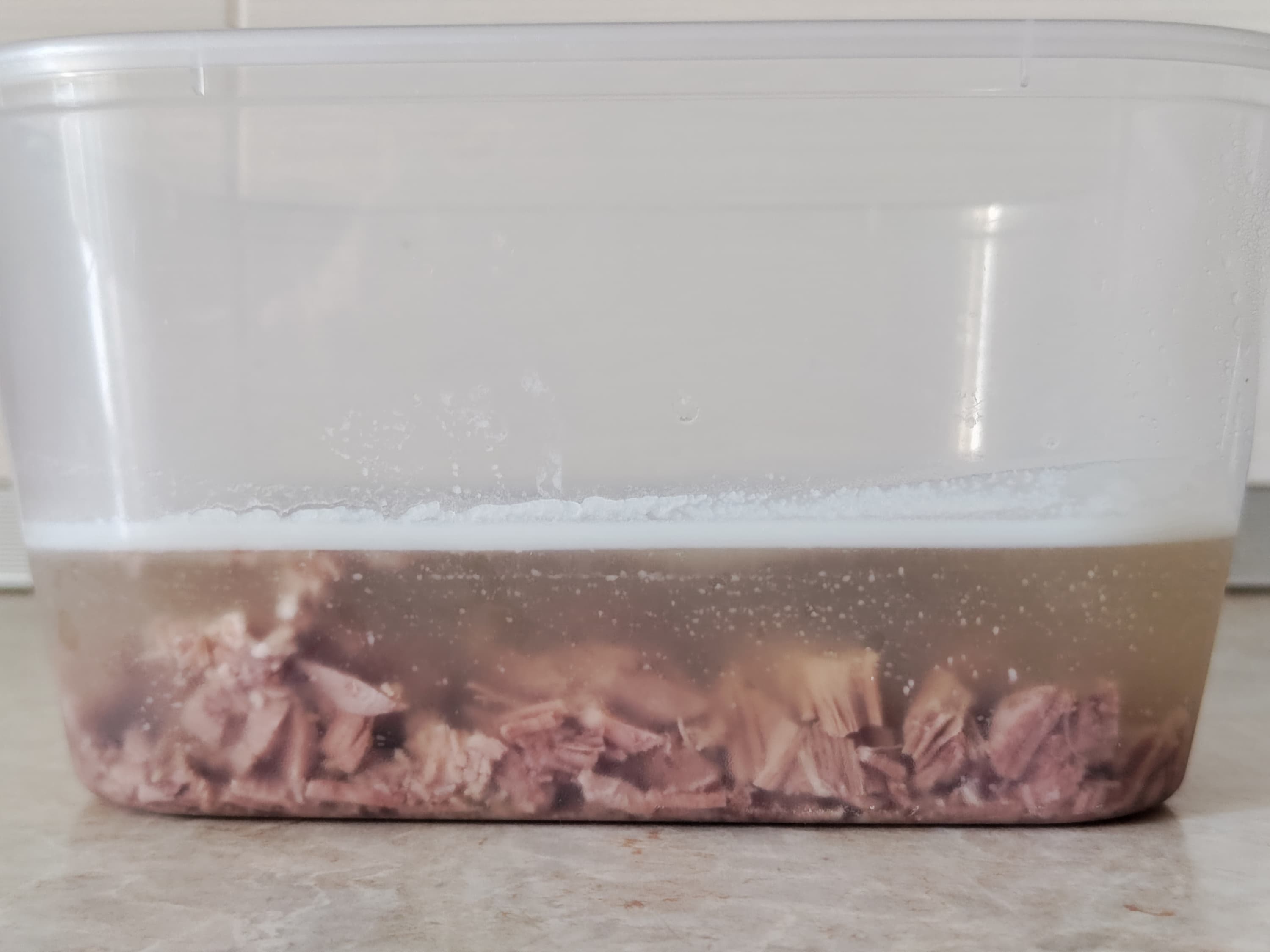 Процедили, разобрали и нарезали мясо, залили бульоном и убрали остывать.