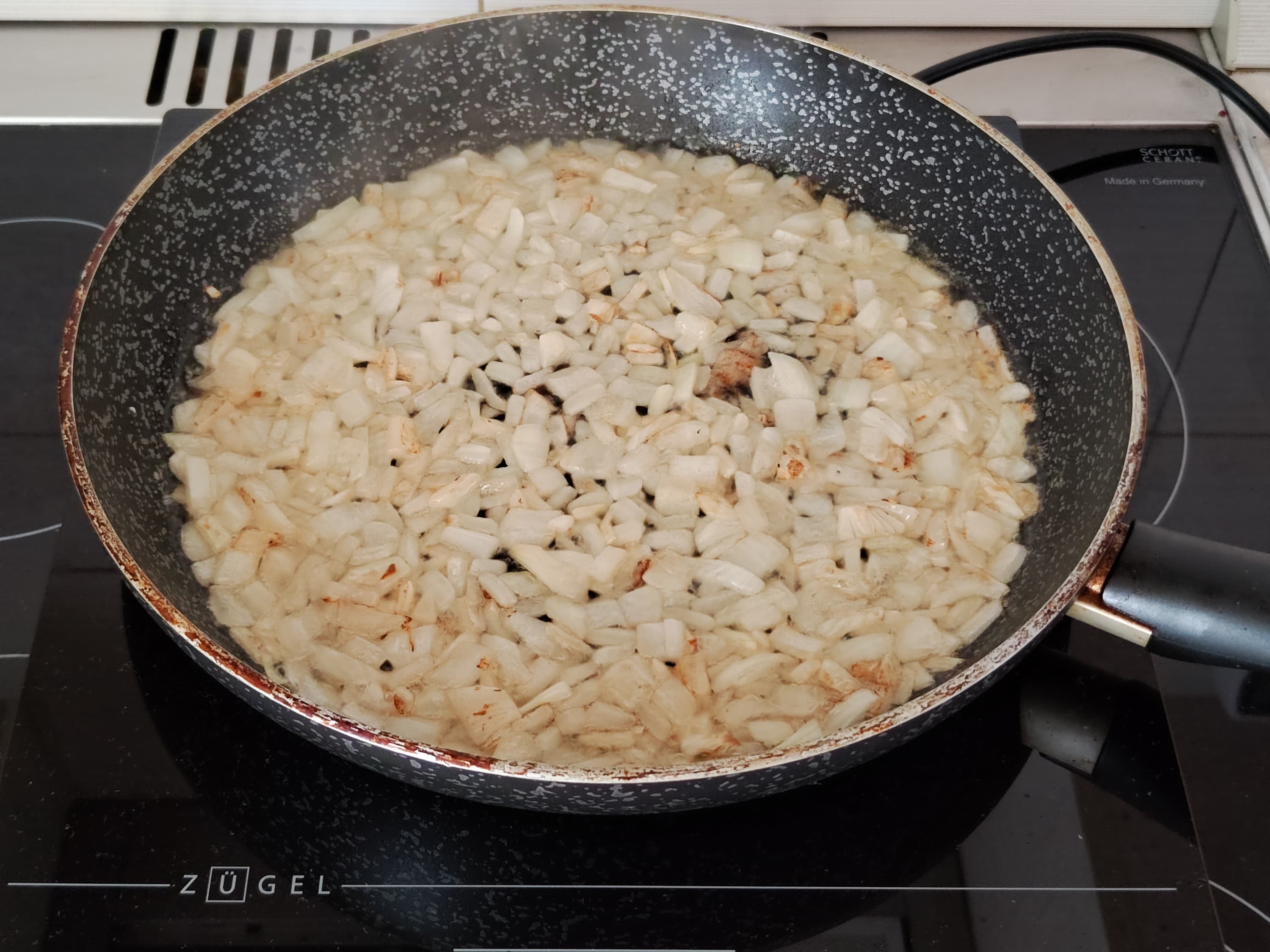 Во время приготовления заправки проверим, как плитка справляется с обжариванием овощей на сковороде, которая превосходит рекомендуемые размеры. Взяли сковороду диаметром 28 см, дно, непосредственно соприкасающееся с нагревающейся поверхностью — 22 см. Начали с обжарки лука.