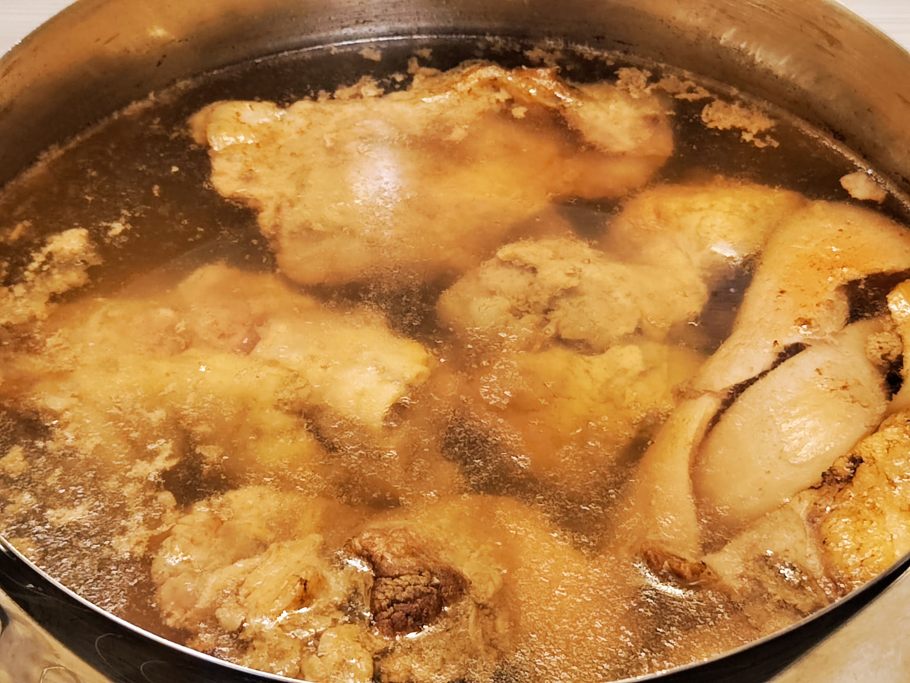 Бульон мы решили сварить из говяжьих костей и одной небольшой свиной голени. Взяли самую большую имеющуюся в наличии кастрюлю, заполнили ее водой и поставили на весы. Вес кастрюли с содержимым оказался равен 6,5 кг.