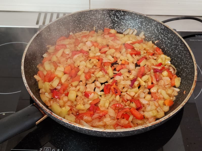 Мы были искренне поражены, когда большая сочная луковица быстро и легко зажарилась за очень короткое время. Ага, тогда добавим два сочных болгарских перца! Уж их сок точно замедлит обжаривание.