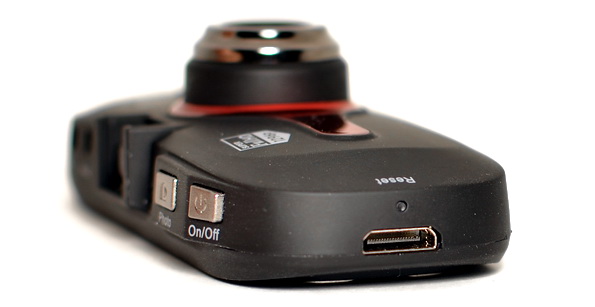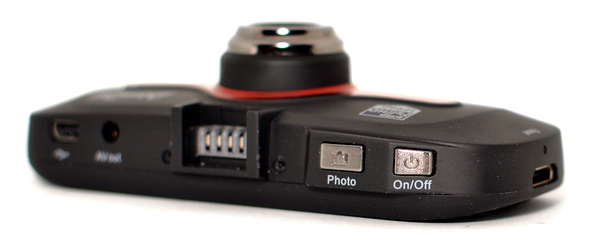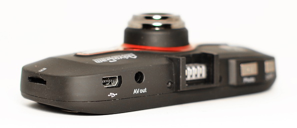 Еще два разъема установлены бок о бок наверху – аналоговый AV-выход и привычный для регистраторов miniUSB. Заранее обратим внимание, что последний пусть и позволяет принимать питание от прикуривателя, но в действительности используется лишь при подключении к компьютеру. «Настоящий» порт питания находится прямо в кронштейне, лишая необходимости возиться с кабелем при снятии и установке регистратора.