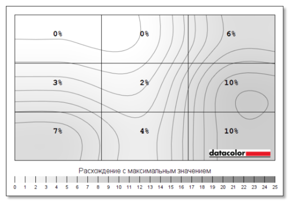 Если доверить измерение параметров экрана калибратору Spyder5, то максимальное отклонение яркости нашего образца зафиксировано на отметке 10%.