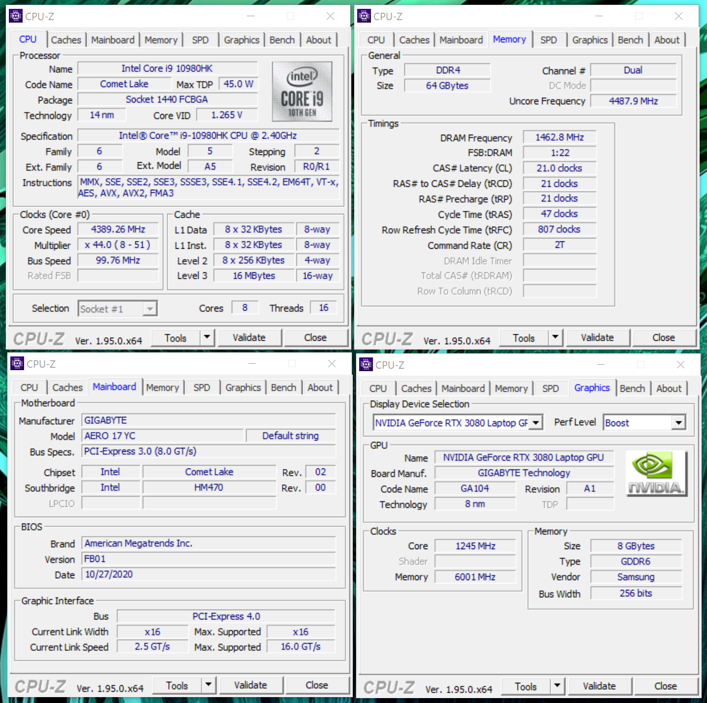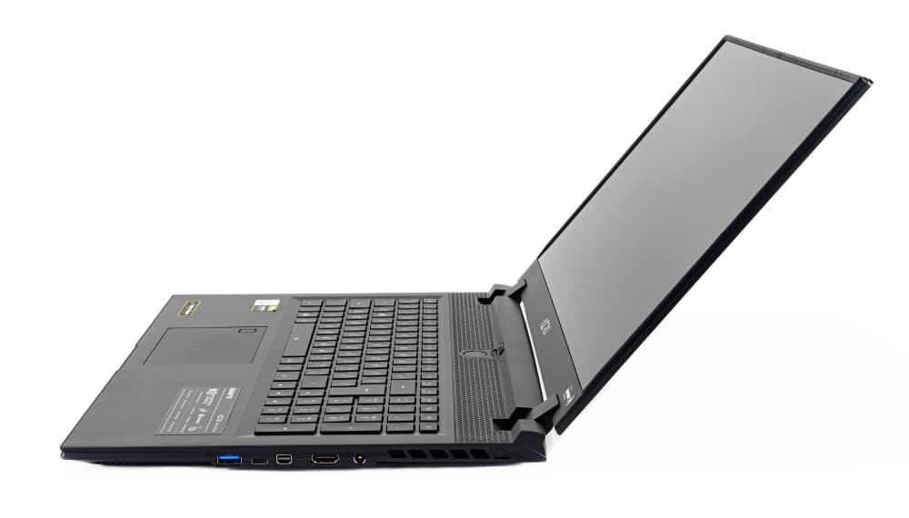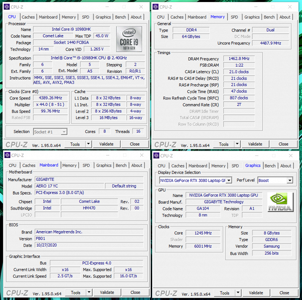 Модель Aero 17 HDR (RTX 30-серия), которую мы изучим сегодня, характерна процессором Intel Core i9-10980HK (2,4–5,3 ГГц), 64 Гбайт оперативной памяти с частотой 2933 МГц /3200 МГц, встроенным ГП GeForce RTX 3080 и парой твердотельных накопителей формата M.2 ёмкостью 1024 Гбайт каждый (NVMe PCIe Gen3, в RAID не объединены). Матрица 17,3" с разрешением 4K (3840x2160) обладает стандартной для работы частотой обновления 60 Гц для графического ядра Intel Ultra HD Graphics 630 в составе процессора, и 300 Гц – когда к обработке 3D-контента подключается ГП RTX 3080 (технология Nvidia Optimus), однако, ключевой особенностью дисплея является индивидуальная калибровка на заводе, после чего полученный профиль встраивается в ОС, а также функция HDR.