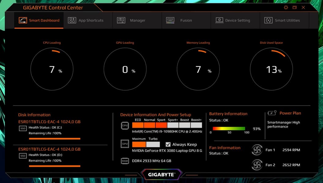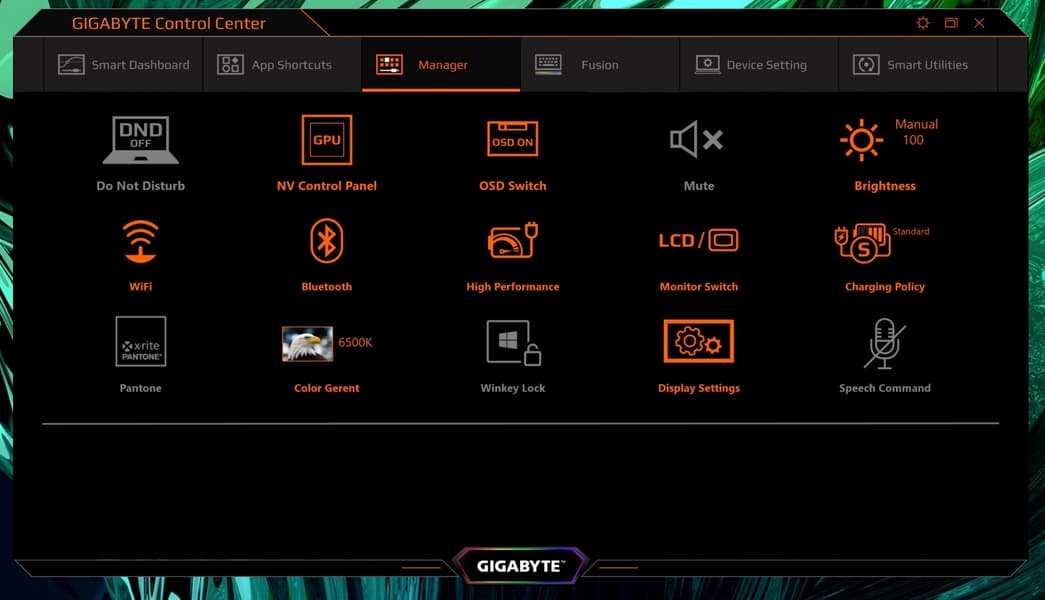 Среди предустановленных приложений безусловный интерес представляет Gigabyte Control Center. Это простое в использовании ПО для управления большинством ключевых параметров ноутбука, а также для мониторинга состояния системы.