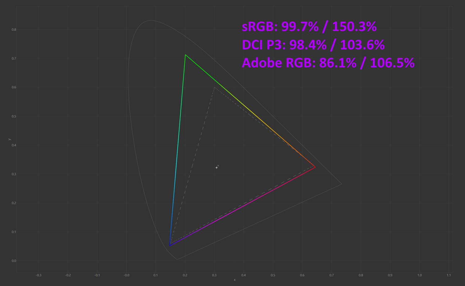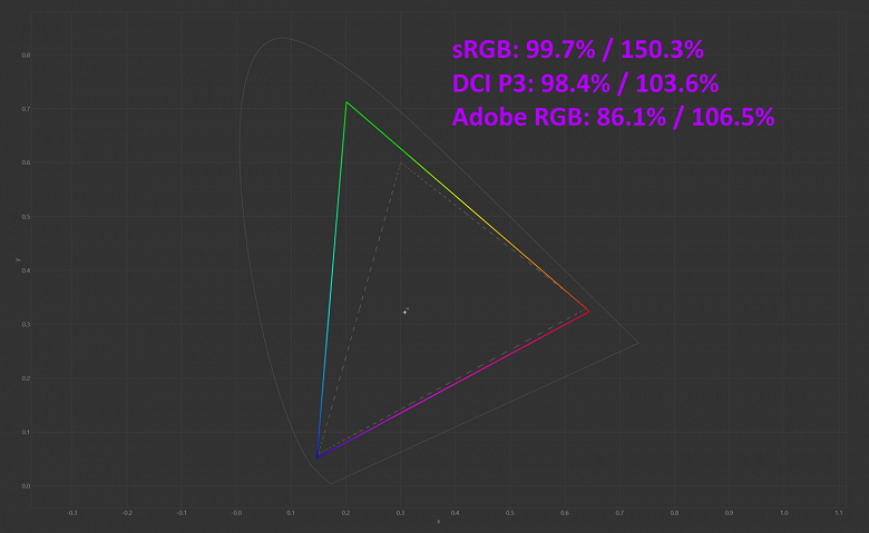 Полные цветовые охваты превышают 100%, в то время как обычные значения для sRGB и DCI P3 составляют около 99%, а Adobe RGB – около 86%.