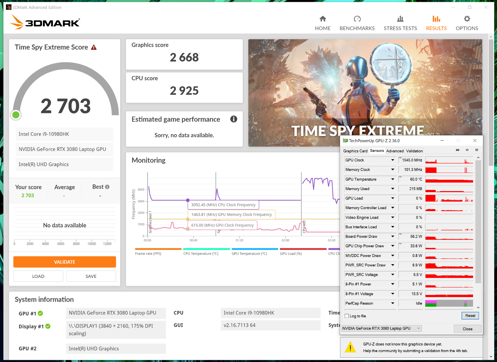 Если же отключить блок питания, то результат в графических тестах будет практически вдвое ниже. Это обычная практика для высокопроизводительных ноутбуков. Частота графического процессора будет колебаться в районе 615-650 МГц, его энергопотребление не превысит отметку 33 Вт (энергопотребление видеоподсистемы в целом – 0 до 56 Вт), а процессор снизит частоту на 500-800 МГц относительно предыдущих условий тестирования с питанием от сети. Частота видеопамяти остаётся неизменной.