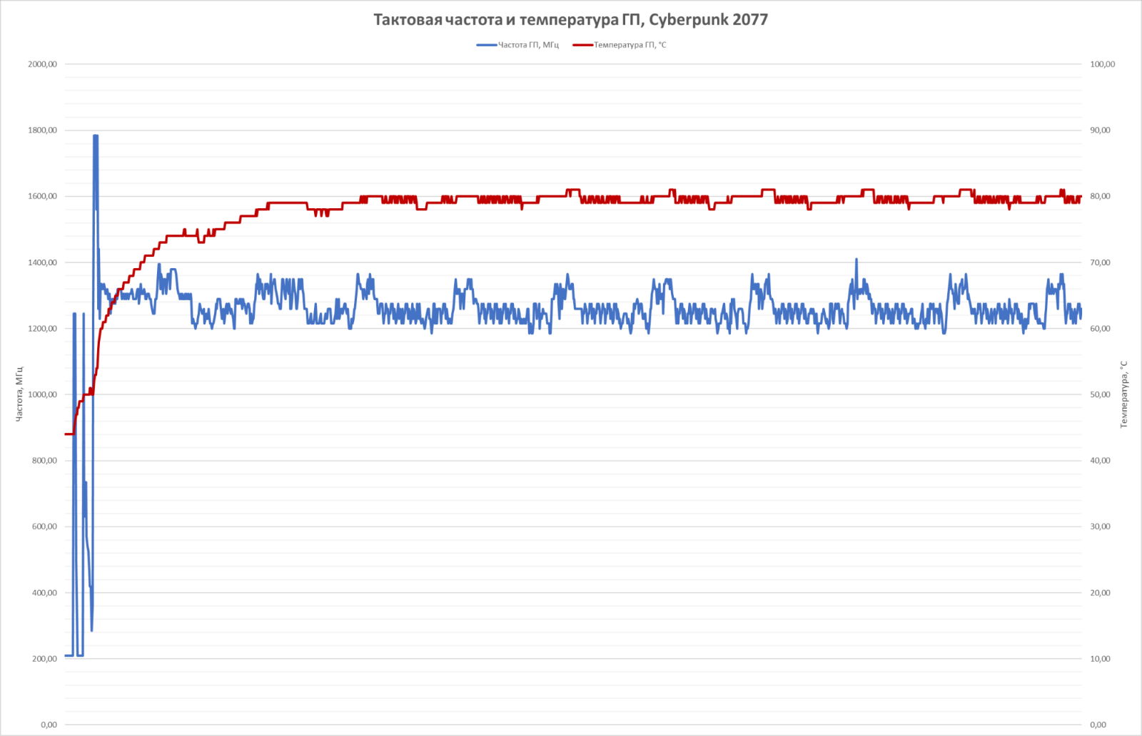 Температура графического процессора в играх в устоявшемся режиме составляет около 80 градусов, а его тактовая частота колеблется в районе 1200 - 1400 МГц в зависимости от нагрузки.