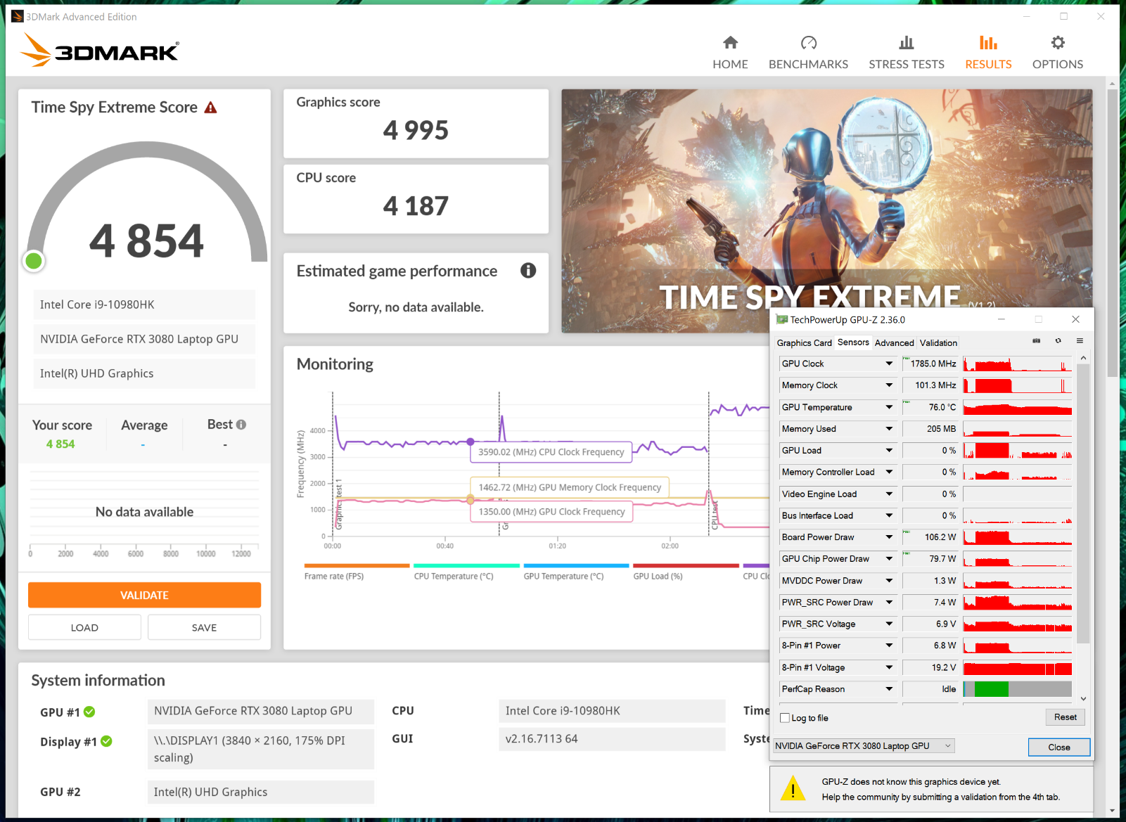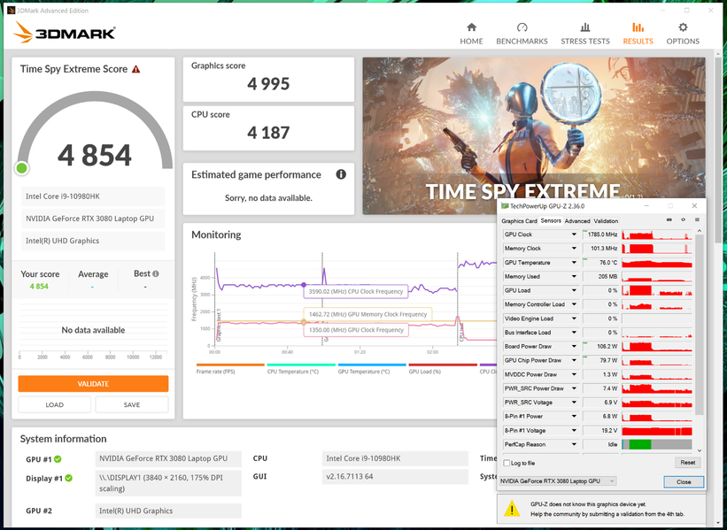 Производительность в некоторых тестах мы представим в двух режимах – при подключённом внешнем блоке питания и при работе от батареи. В бенчмарке 3DMark Time Spy Extreme результат в графическом тесте вплотную подбирается к отметке в 5000 баллов. Частота графического процессора колеблется в районе 1350 МГц, его энергопотребление ограничено отметкой 80 Вт (энергопотребление видеоподсистемы в целом - до 106 Вт), а частота процессора при необходимости превышает отметку 4 ГГц (до 4,4 ГГц) при полной его загрузке.