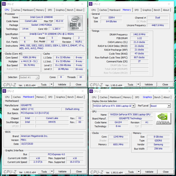 Сразу же стоит отметить, что мобильные графические процессоры GeForce RTX 30-серии существуют в двух (пока что) вариантах, но какой именно будет установлен в ноутбуке – загадка. По крайней мере до тех пор, пока кто-либо не опубликует скриншот какой-либо информационной программы. А ведь разница между Max-Q и Max-P может составлять 20-40% в зависимости от задачи. Самый быстрый способ понять какой именно вариант установлен в ноутбук – посмотреть скорость работы видеопамяти. Для Max-Q это 12 Gbps (1500 МГц, эффективная 12000 МГц), а для Max-P – 14 Gbps (1750 МГц, эффективная 14000 МГц). При этом, кроме частоты видеопамяти, будет снижена и частота графического процессора и ограничено энергопотребление видеокарты в целом. С точки зрения общего энергопотребления ноутбука и требований к системе охлаждения, героя этого материала, оснащенного самым мощным на сегодня мобильным ЦП Intel Core i9-10980HK версия видеоподсистемы на базе GeForce RTX 30-серии, вполне ожидаемо оказалась Max-Q. При стоимости ноутбука заметно выше 300 тысяч рублей хотелось бы получить Max-P – максимально возможную производительность. Однако, далеко не факт, что в разработанный специально для Aero 17 HDR изящный корпус достаточно компактных габаритов (толщина немногим более 21 мм), удалось бы разместить адекватную систему охлаждения, способную рассеивать существенно больше тепла!
