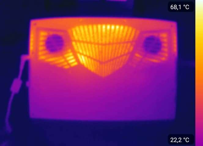 Вывод горячего воздуха за пределы корпуса осуществляется сзади и по обе стороны корпуса. Наглядно это мы продемонстрируем при помощи тепловизора немного позже.
