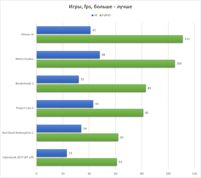 Не забудем и про развлечения в виде игр. Настройки выставим адекватно максимальные (то есть без 200% разрешения и подобных настроек, с которыми не все настольные видеокарты справляются), значения – средний показатель кадров в секунду.